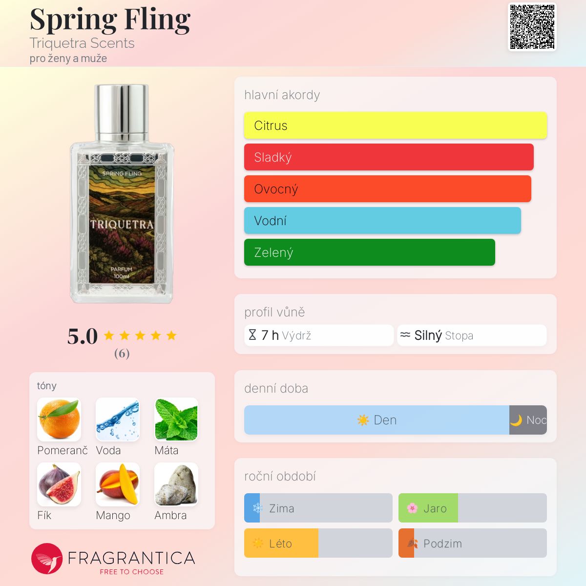 Spring Fling podle Triquetra Scents je Aromatic Fruity vůně pro ženy a muže. Toto je nová vůně. Spring Fling byl/a uveden/a v roce 2025. Vrchní tóny jsou Pomeranč, Fík a Kardamom; střední tóny jsouVodní tóny, Máta peprná a Mango ; základní tóny jsou Ambra a Mech.