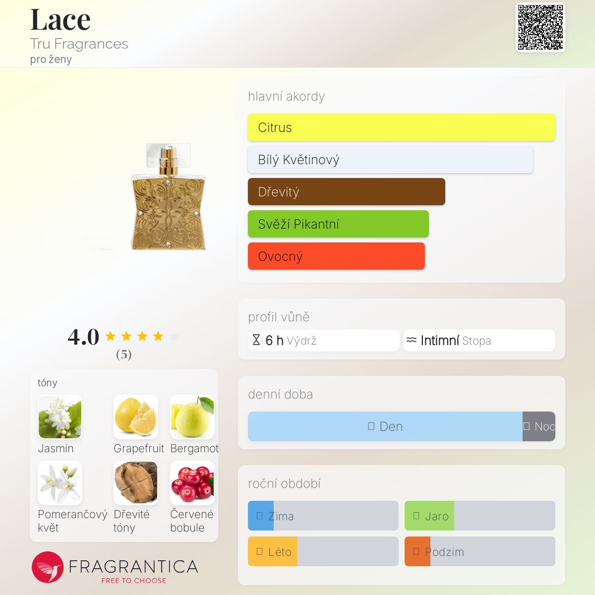 Lace podle Tru Western je Floral Woody Musk vůně pro ženy. Lace byl/a uveden/a v roce 2011. Vrchní tóny jsou Grapefruit, Bergamot a Červené bobule; střední tóny jsouJasmín, Pomerančový květ a Růže ; základní tóny jsou Dřevité tóny a Bílé pižmo.