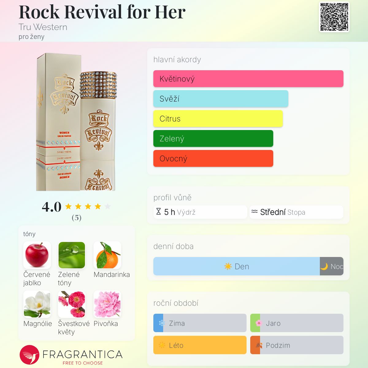Rock Revival for Her podle Tru Western je Floral Woody Musk vůně pro ženy. Rock Revival for Her byl/a uveden/a v roce 2012. Vrchní tóny jsou Červené jablko, Zelené tóny a Mandarinka; střední tóny jsouMagnólie, Švestkové květy a Pivoňka ; základní tóny jsou Bílé pižmo, Dub a Jantar (ambra).