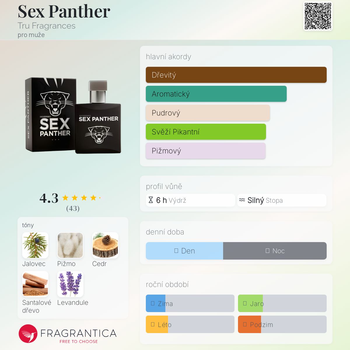 Sex Panther podle Tru Western je Aromatic Fougere vůně pro muže. Vrchní tón je Jalovec ; střední tóny jsouPižmo a Levandule ; základní tóny jsou Cedr a Santalové dřevo.
