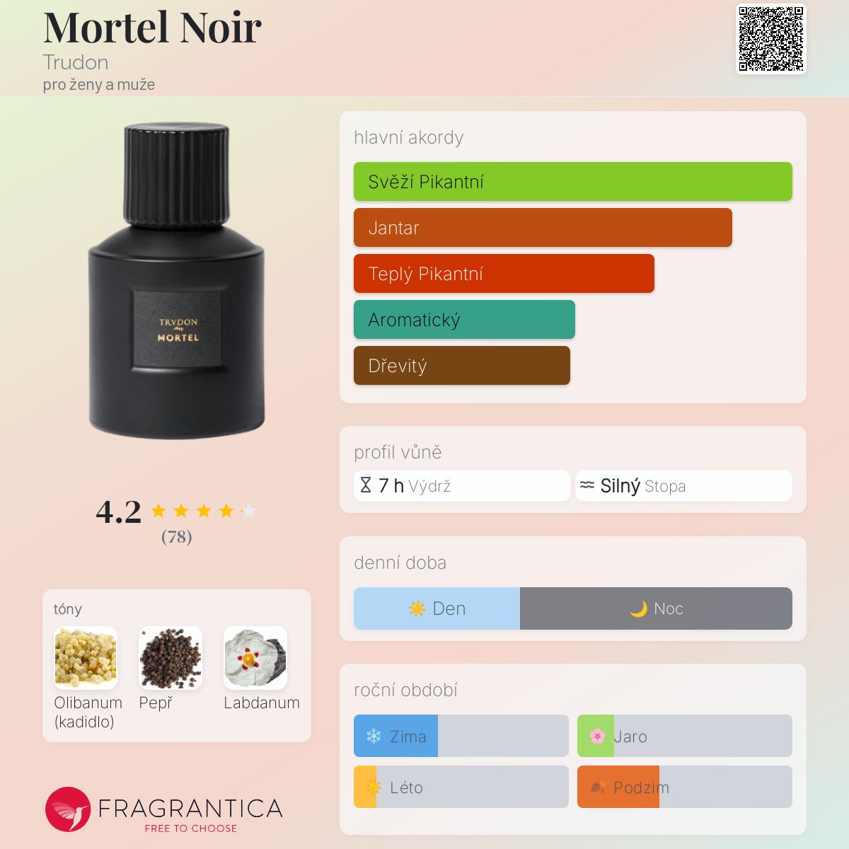 Mortel Noir podle Trudon je vůně pro ženy a muže. Mortel Noir byl/a uveden/a v roce 2023. "Nosem" za touto vůní je Yann Vasnier. Vrchní tón je Madagaskarský pepř ; střední tón jeKadidlo ; základní tón je Labdanum.