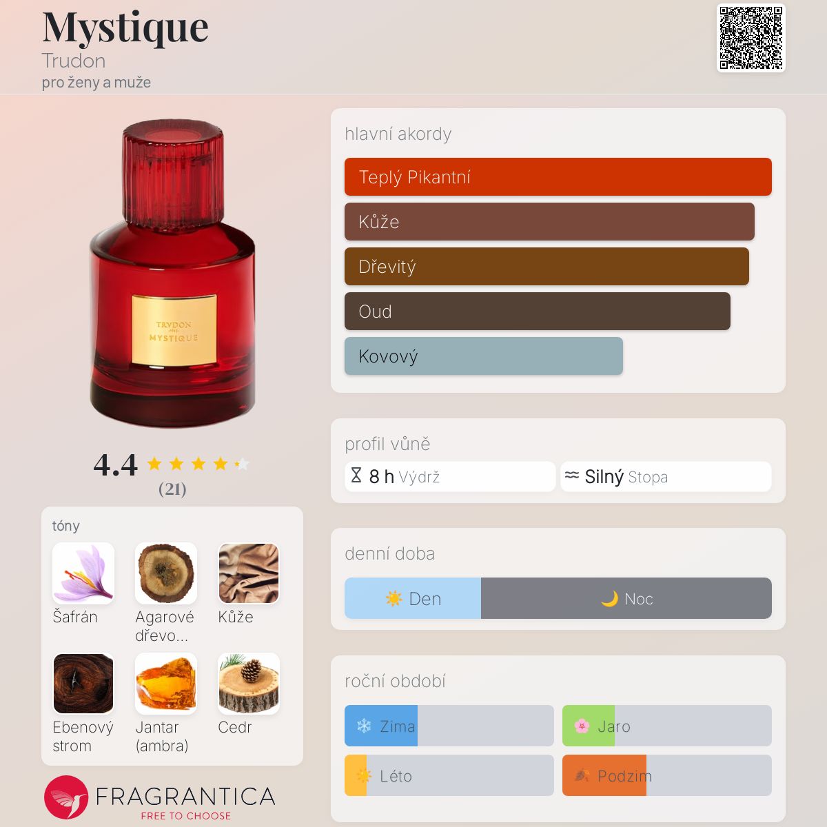 Mystique podle Trudon je Orientální Woody vůně pro ženy a muže. Toto je nová vůně. Mystique byl/a uveden/a v roce 2025. Vrchní tóny jsou Šafrán, Kůže a Cedr; střední tóny jsouAgarové dřevo (oud), Santalové dřevo a Papyrus ; základní tóny jsou Ebenové dřevo, Jantar (ambra) a Pačuli.