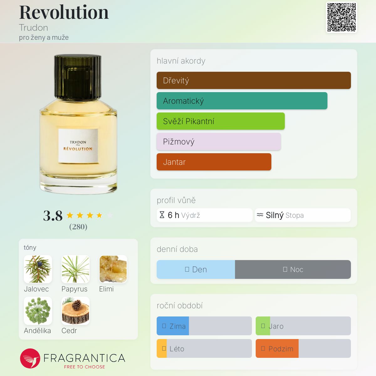 Revolution podle Trudon je Orientální Woody vůně pro ženy a muže. Revolution byl/a uveden/a v roce 2017. "Nosem" za touto vůní je Lyn Harris. Vrchní tón je Pryskyřice elimi ; střední tón jeAndělika ; základní tóny jsou Jalovec, Papyrus a Cedr.