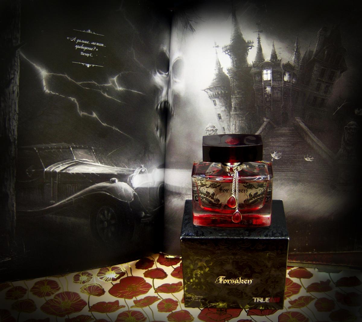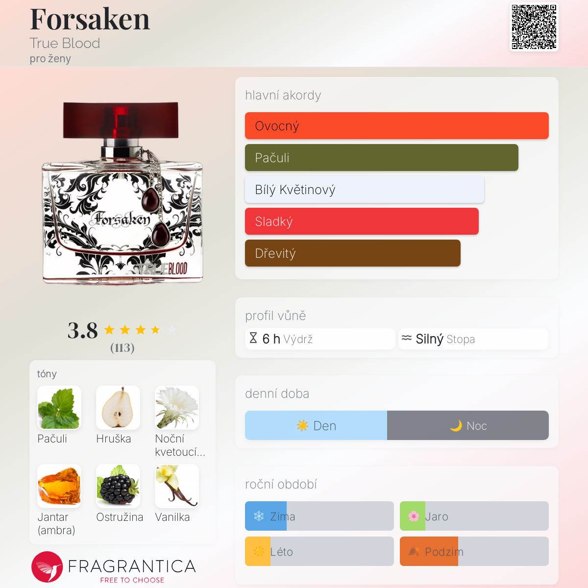 Forsaken podle True Blood je Orientální Floral vůně pro ženy. Forsaken byl/a uveden/a v roce 2012. "Nosem" za touto vůní je Givaudan. Vrchní tóny jsou Hruška, Ostružina a Krvavý pomeranč; střední tóny jsouNoční kvetoucí cereus (kaktus), Švestka a Fialka ; základní tóny jsou Pačuli, Křišťálový jantar, Vanilka a Eben.