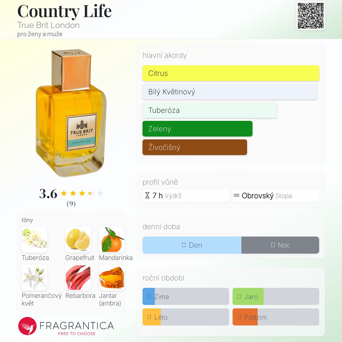 Country Life podle True Brit London je Floral vůně pro ženy a muže. Country Life byl/a uveden/a v roce 2019. "Nosem" za touto vůní je Elodie Durande. Vrchní tóny jsou Grapefruit, Mandarinka a Rebarbora; střední tóny jsouTuberóza, Pomerančový květ a Jasmín ; základní tóny jsou Jantar (ambra), Pižmo a Santalové dřevo.