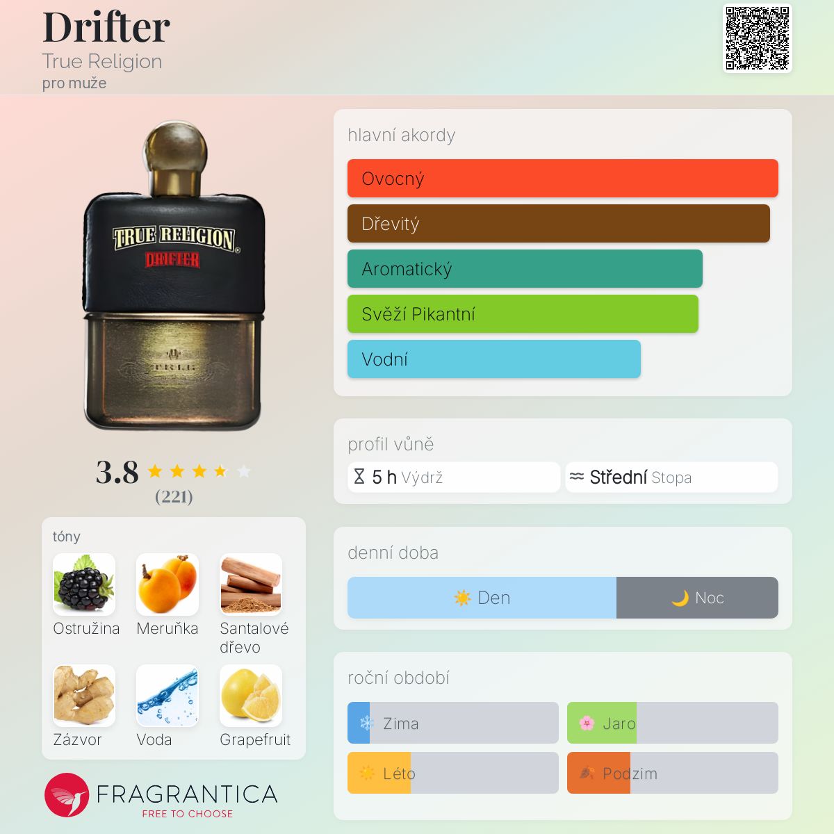 Drifter podle True Religion je Aromatic Fruity vůně pro muže. Drifter byl/a uveden/a v roce 2011. "Nosem" za touto vůní je Yann Vasnier. Vrchní tóny jsou Ostružina, Zázvor, Grapefruit, Hruška a Kardamom; střední tóny jsouMeruňka, Vodní tóny, Jalovcové bobulky a Rozmarýn ; základní tóny jsou Santalové dřevo, Guajakové dřevo, Jantar (ambra) a Vetiver.