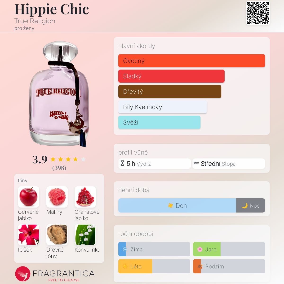 Hippie Chic podle True Religion je Floral Fruity vůně pro ženy. Hippie Chic byl/a uveden/a v roce 2011. "Nosem" za touto vůní je Ellen Molner. Vrchní tóny jsou Červené jablko, Maliny a Granátové jablko; střední tóny jsouIbišek, Konvalinka a Jasmín mnohokvětý ; základní tóny jsou Dřevité tóny a Pižmo.