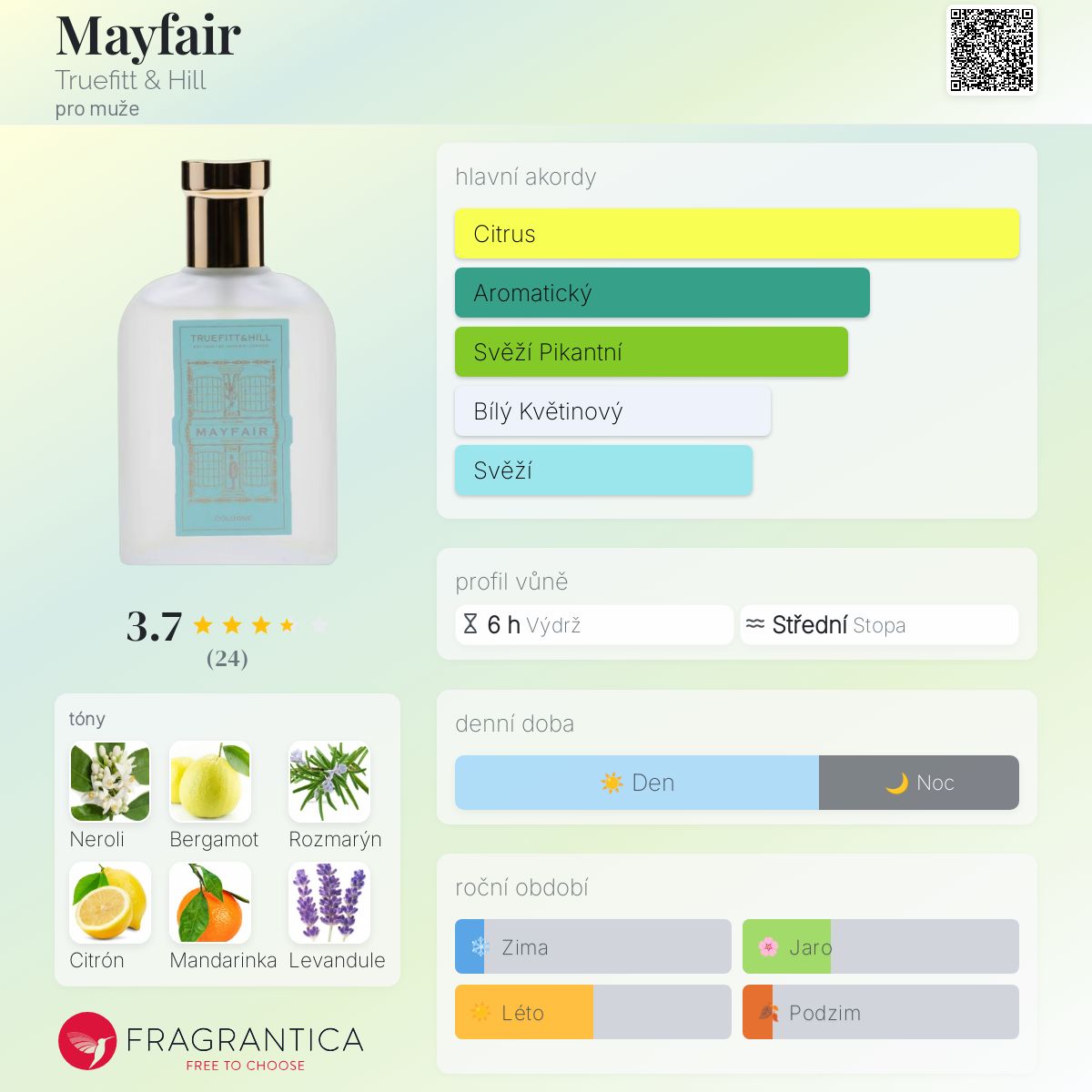 Mayfair podle Truefitt & Hill je Aromatic Fougere vůně pro muže. Mayfair byl/a uveden/a v roce 2023. Vrchní tóny jsou Bergamot, Rozmarýn, Citrón a Mandarinka; střední tóny jsouNeroli, Levandule a Jasmín ; základní tón je Pižmo.