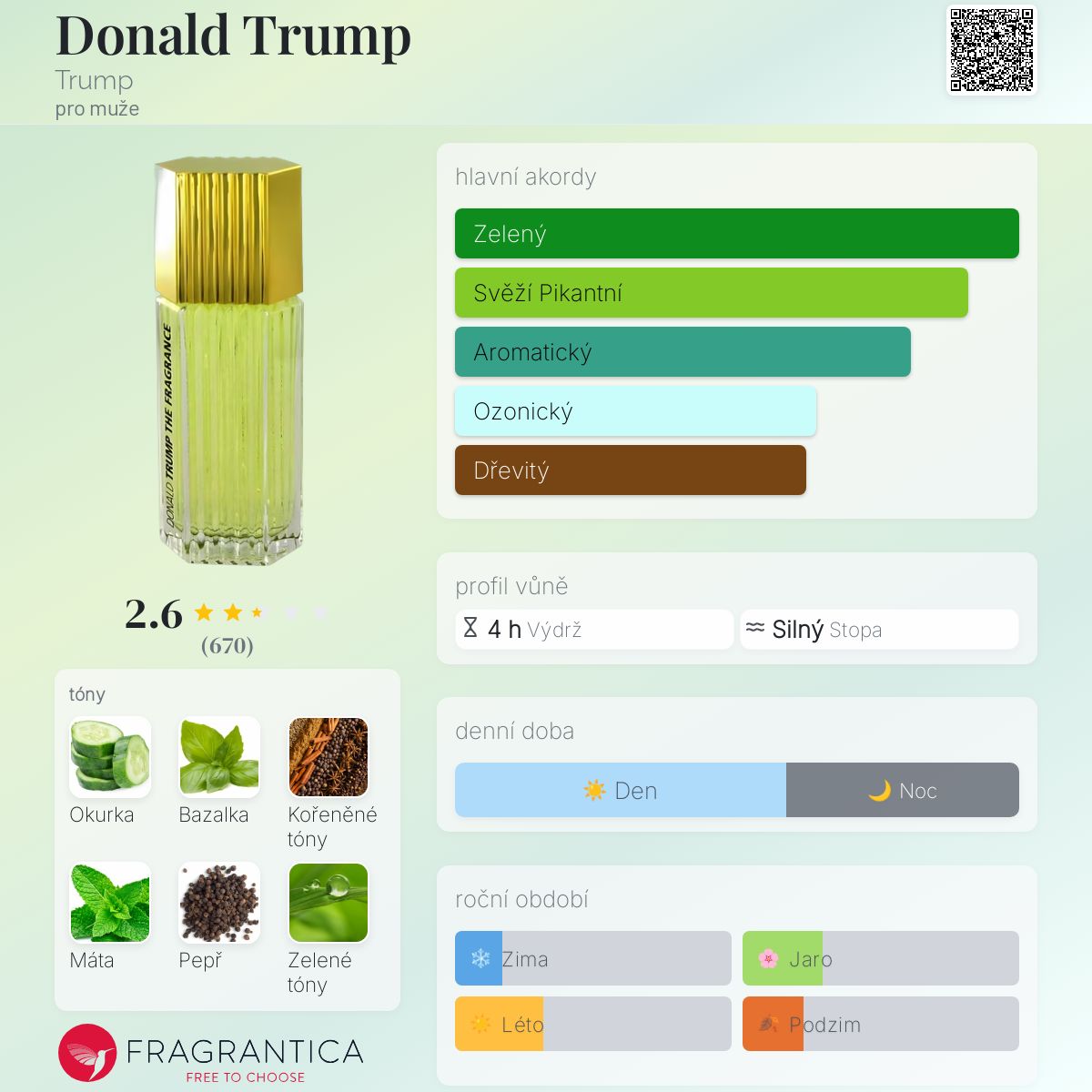 Donald Trump podle Trump je Woody Aromatic vůně pro muže. Donald Trump byl/a uveden/a v roce 2004. "Nosem" za touto vůní je Annie Buzantian. Vrchní tóny jsou Okurka, Černá bazalka, Máta a Citrusy; střední tóny jsouKořeněné tóny, Pepř, Bylinné tóny a Dřevité tóny ; základní tóny jsou Kořeněné tóny, Exotická dřeva a Vetiver.