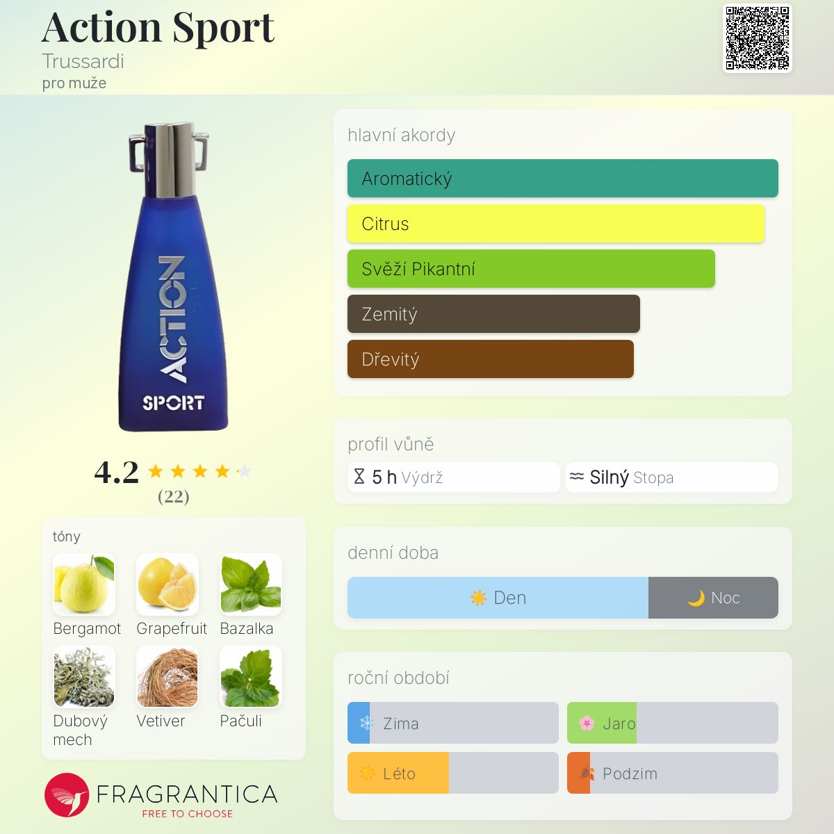 Action Sport podle Trussardi je Aromatic Fougere vůně pro muže. Action Sport byl/a uveden/a v roce 1993. Vrchní tóny jsou Bergamot, Grapefruit, Citrón a Mandarinka; střední tóny jsouBazalka, Levandule, Neroli, Pelargónie, Estragon, Jasmín a Kosatec ; základní tóny jsou Dubový mech, Vetiver, Pačuli, Ambra, Fazole tonka a Pižmo.