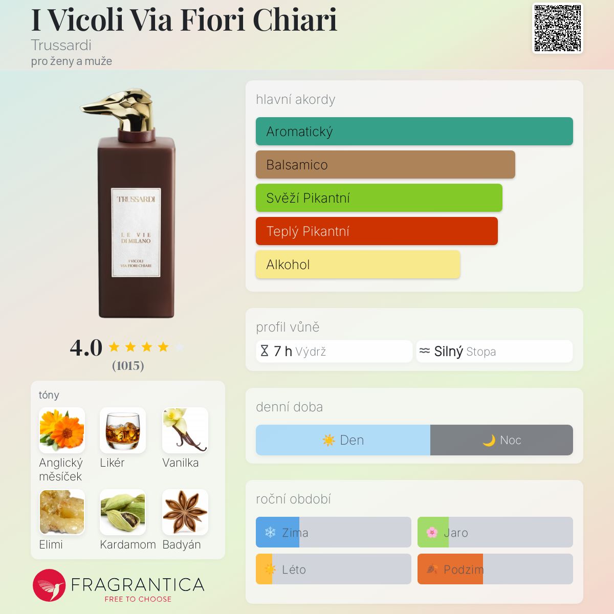 I Vicoli Via Fiori Chiari podle Trussardi je Orientální Spicy vůně pro ženy a muže. I Vicoli Via Fiori Chiari byl/a uveden/a v roce 2020. "Nosem" za touto vůní je Pierre-Constantin Guéros. Vrchní tóny jsou Guatemalský kardamom, Badyán a Italský citrón; střední tóny jsouMěsíček, Elemi, Černý pepř a Pačuli ; základní tóny jsou Likér a Madagaskarská vanilka.