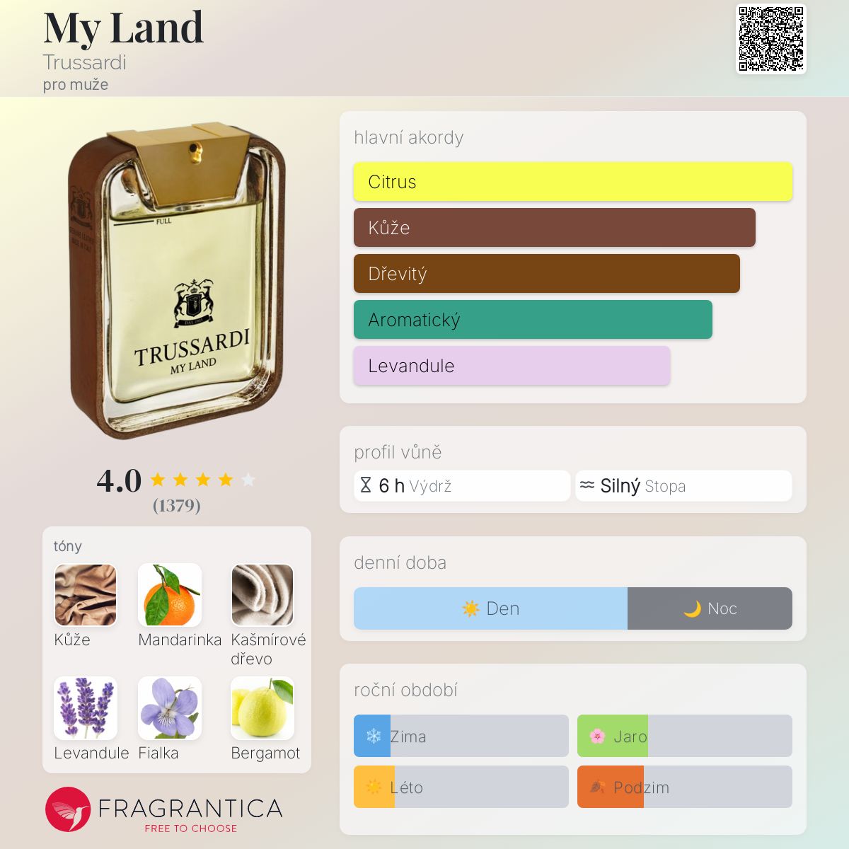 My Land podle Trussardi je Aromatic Fougere vůně pro muže. My Land byl/a uveden/a v roce 2012. "Nosem" za touto vůní je Alexandra Kosinski. Vrchní tóny jsou Zelená mandarinka a Bergamot; střední tóny jsouLevandule, Fialka a Calone ; základní tóny jsou Kůže, Kašmírové dřevo, Fazole tonka a Vetiver.