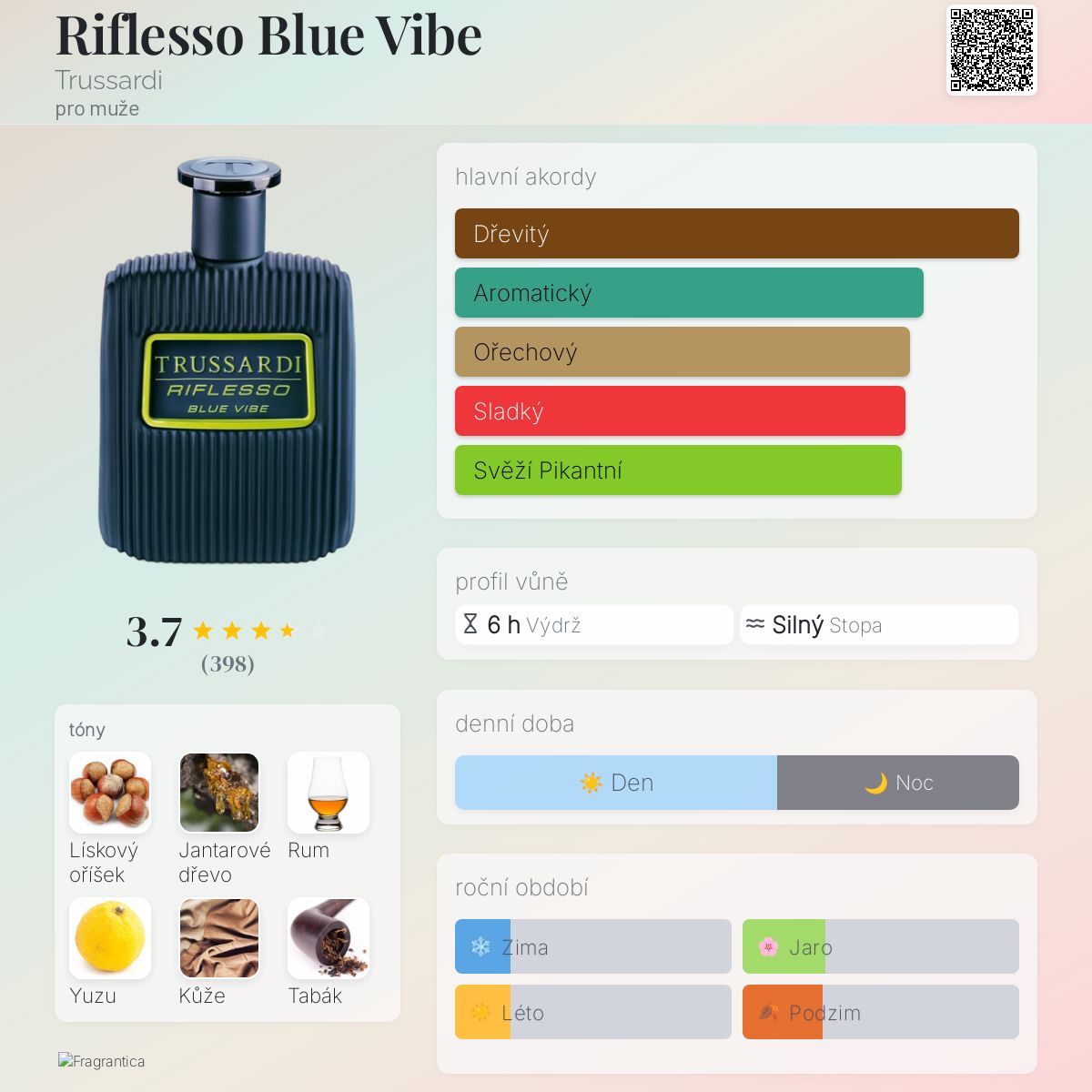 Riflesso Blue Vibe podle Trussardi je Orientální Woody vůně pro muže. Riflesso Blue Vibe byl/a uveden/a v roce 2019. "Nosem" za touto vůní je Veronique Nyberg. Vrchní tóny jsou Rum, Yuzu a Davana; střední tóny jsouLískový oříšek, Pelargónie a Pelyněk ; základní tóny jsou Jantarové dřevo, Kůže a Tabák.