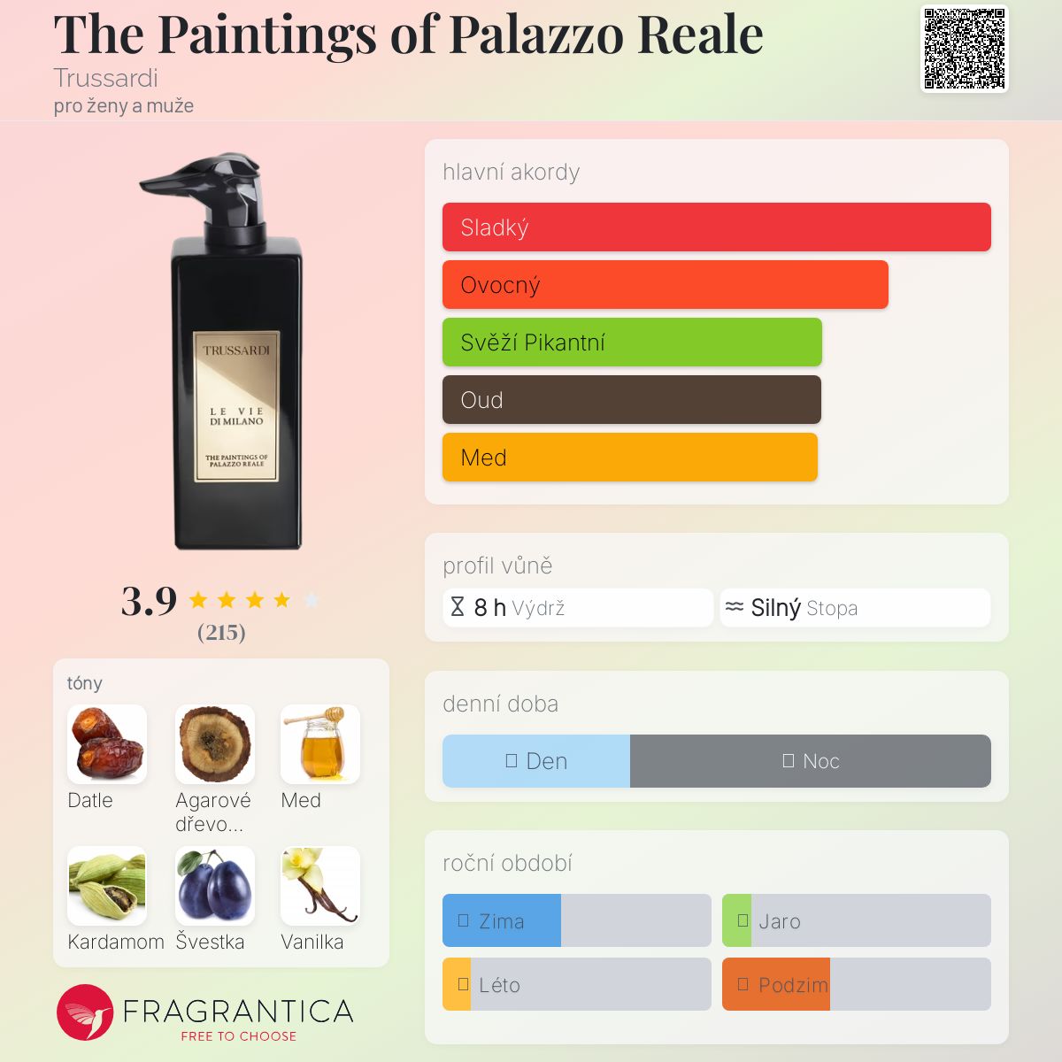The Paintings of Palazzo Reale podle Trussardi je Woody Spicy vůně pro ženy a muže. The Paintings of Palazzo Reale byl/a uveden/a v roce 2022. "Nosem" za touto vůní je Pierre-Constantin Guéros. Vrchní tóny jsou Datle, Švestka a Timur; střední tóny jsouMed, Kardamom, Mandlové mléko a Gurjanský balzám ; základní tóny jsou Agarové dřevo (oud), Bourbonská vanilka, Olibanum, Jantar (ambra) a Pačuli.