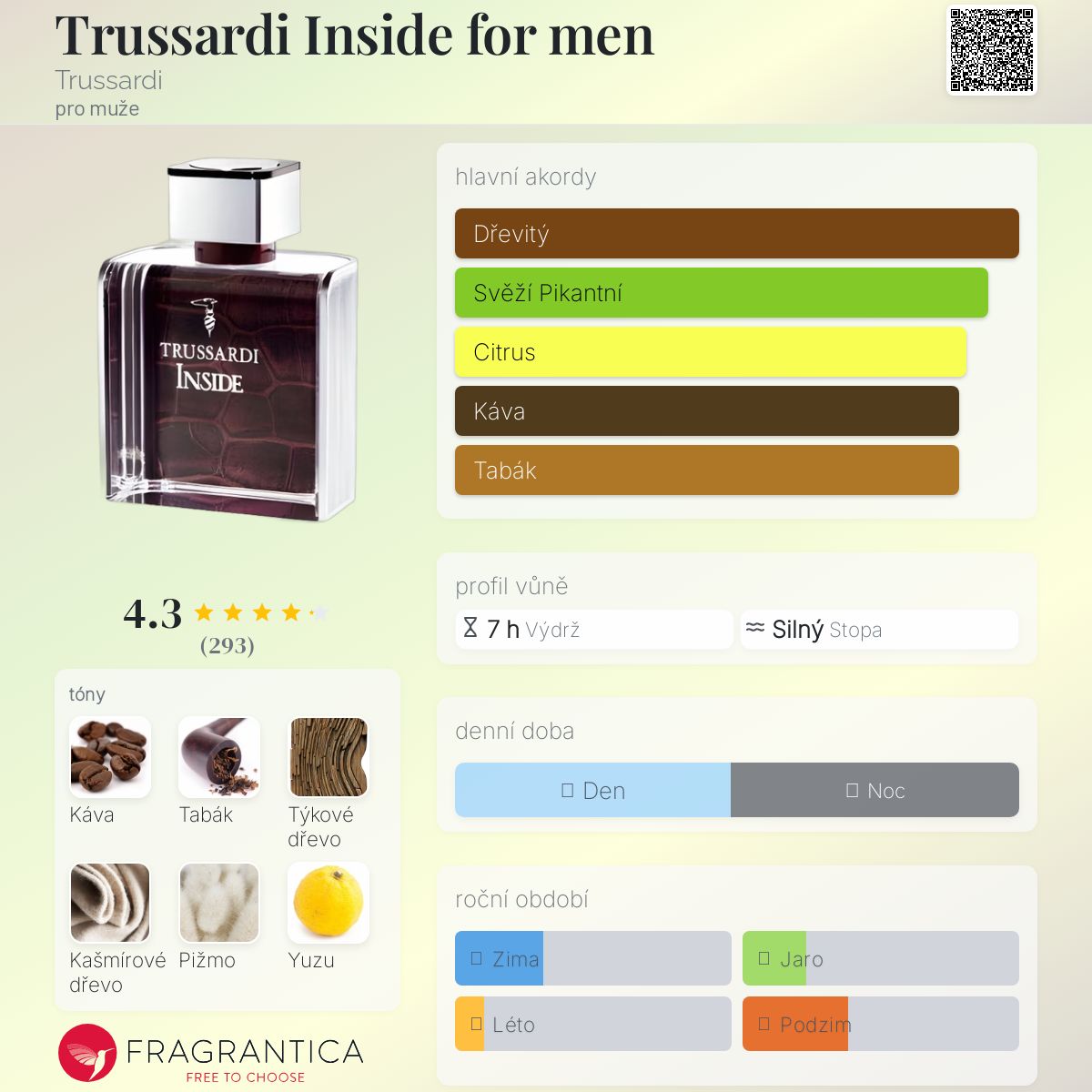 Trussardi Inside for men podle Trussardi je Orientální Woody vůně pro muže. Trussardi Inside for men byl/a uveden/a v roce 2006. "Nosem" za touto vůní je Nathalie Lorson. Vrchní tóny jsou Yuzu, Bazalka a Bergamot; střední tóny jsouKáva, Tabák a Bílý pepř ; základní tóny jsou Týkové dřevo, Kašmírové dřevo a Pižmo.