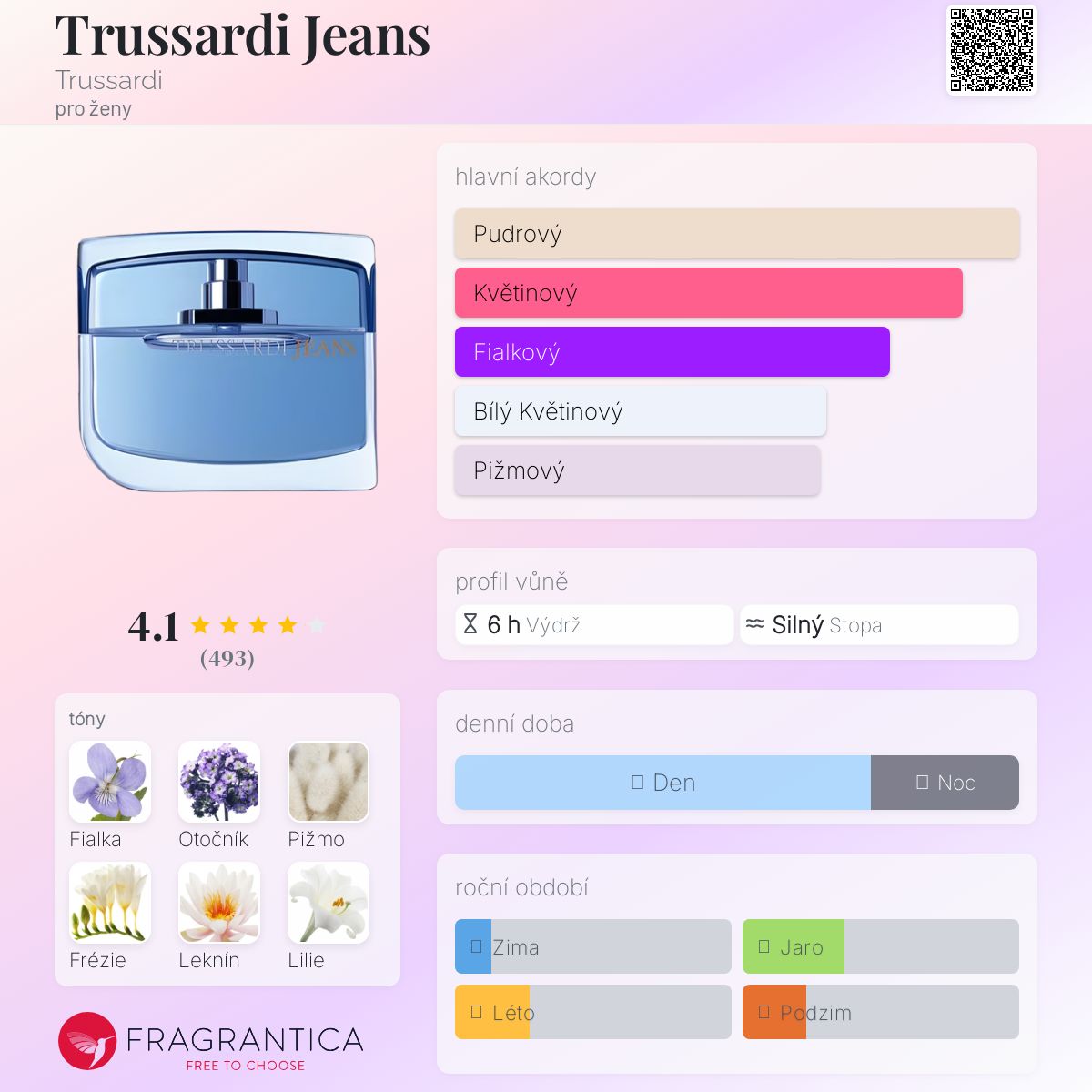 Trussardi Jeans podle Trussardi je Floral vůně pro ženy. Trussardi Jeans byl/a uveden/a v roce 2003. "Nosem" za touto vůní je Anne Flipo. Vrchní tóny jsou Fialka a Leknín; střední tóny jsouFrézie, Lilie a Tuberóza ; základní tóny jsou Otočník, Bílé pižmo a Šuškarda.