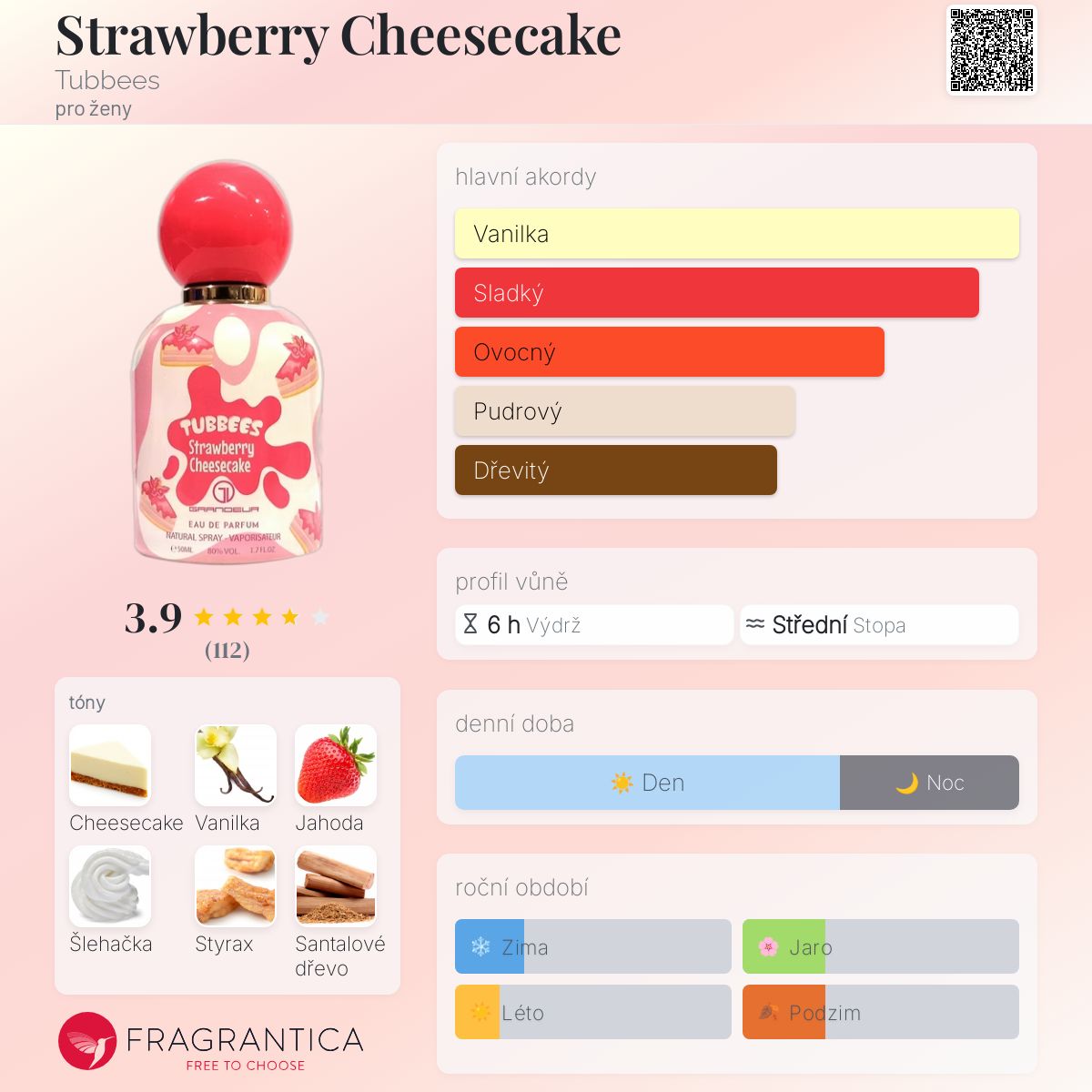 Strawberry Cheesecake podle Tubbees je Floral Fruity Gourmand vůně pro ženy. Strawberry Cheesecake byl/a uveden/a v roce 2024. Vrchní tóny jsou Cheesecake, Vanilka a Jahoda; střední tóny jsouVanilka, Šlehačka a Santalové dřevo ; základní tóny jsou Vanilka a Styrax.