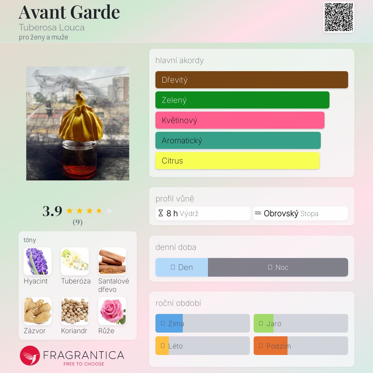Avant Garde podle Tuberosa Louca je Orientální Fougere vůně pro ženy a muže. Avant Garde byl/a uveden/a v roce 2023. "Nosem" za touto vůní je Alexandre Gutvilen. Vrchní tóny jsou Hyacint, Zázvor, Citrón, Hruška, Bergamot a Mandarinka; střední tóny jsouTuberóza, Koriandr, Francouzská růže, Ylang-Ylang a Květ hořkého pomeranče ; základní tóny jsou Santalové dřevo, Vanilka, Vetiver a Pačuli.