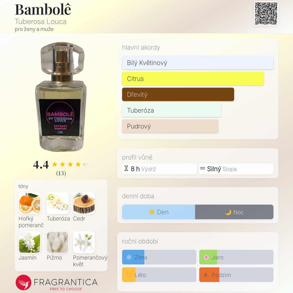 Bambolê podle Tuberosa Louca je Orientální Floral vůně pro ženy a muže. Bambolê byl/a uveden/a v roce 2023. "Nosem" za touto vůní je Junior Souza. Vrchní tóny jsou Hořký pomeranč, Pomerančový květ, Zázvor a Bergamot; střední tóny jsouTuberóza, Indický jasmín a Pomerančový květ ; základní tóny jsou Virginský cedr, Bílé pižmo, Madagaskarská vanilka a Santalové dřevo.