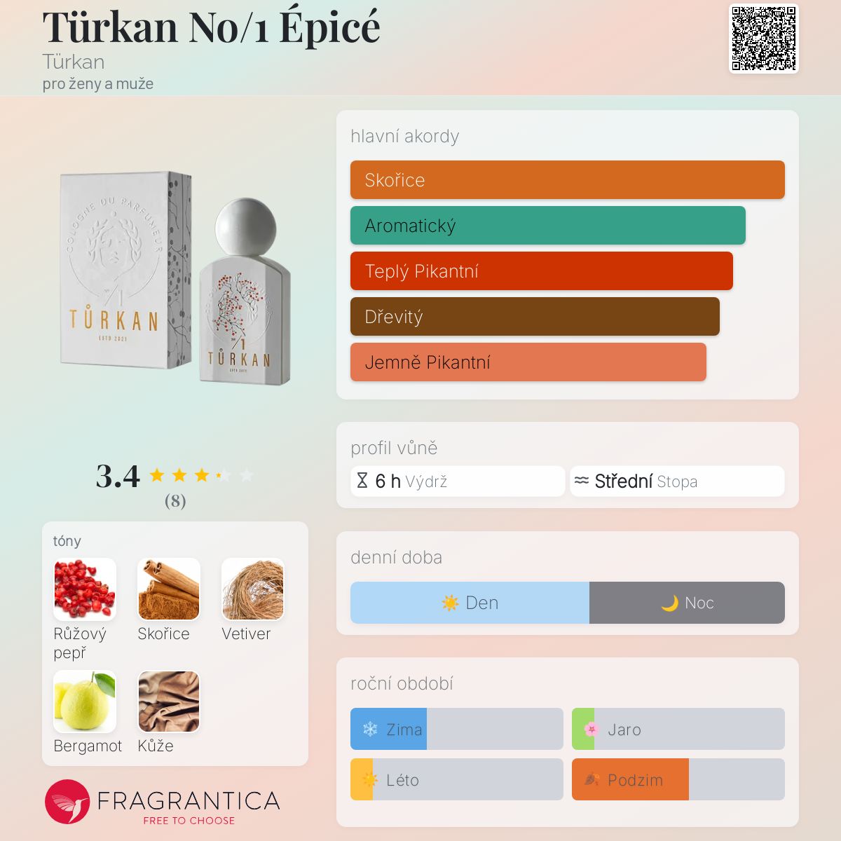 Türkan No/1 Épicé podle Türkan je vůně pro ženy a muže. Türkan No/1 Épicé byl/a uveden/a v roce 2021. Vrchní tóny jsou Růžový pepř a Bergamot; střední tón jeSkořice ; základní tóny jsou Vetiver a Kůže.