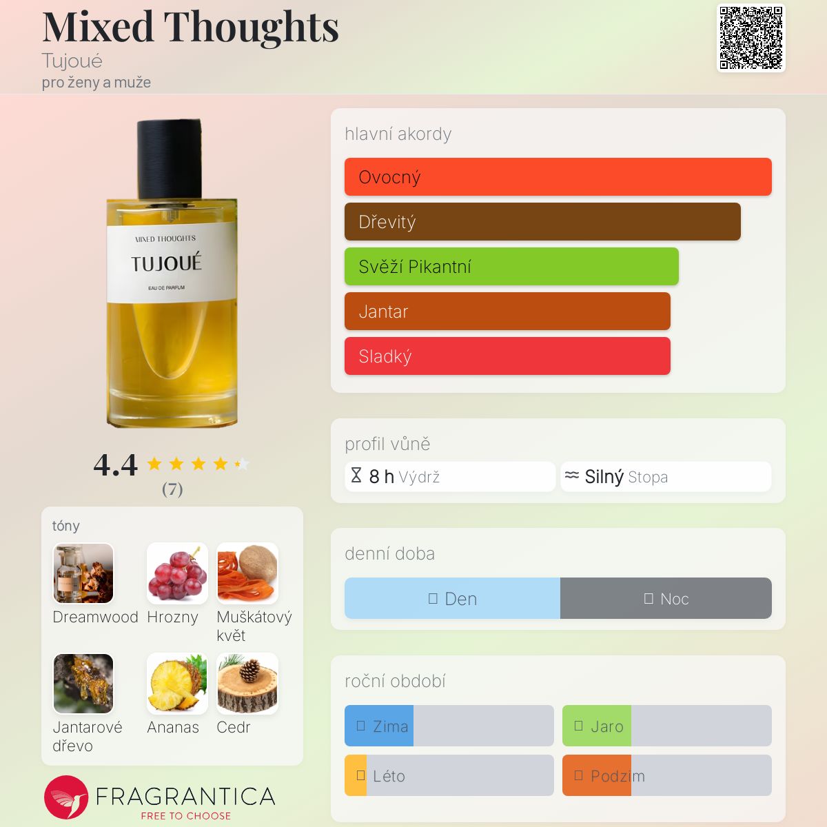 Mixed Thoughts podle Tujoué je Woody Chypre vůně pro ženy a muže. Mixed Thoughts byl/a uveden/a v roce 2022. "Nosem" za touto vůní je Jorge Lee. Vrchní tóny jsou Hrozny, Ananas, Jedle a Citrón; střední tóny jsouMuškátový květ, Cedr, Brambořík a Orris ; základní tóny jsou Dreamwood, Jantarové dřevo, Dubový mech a Slaměnka.