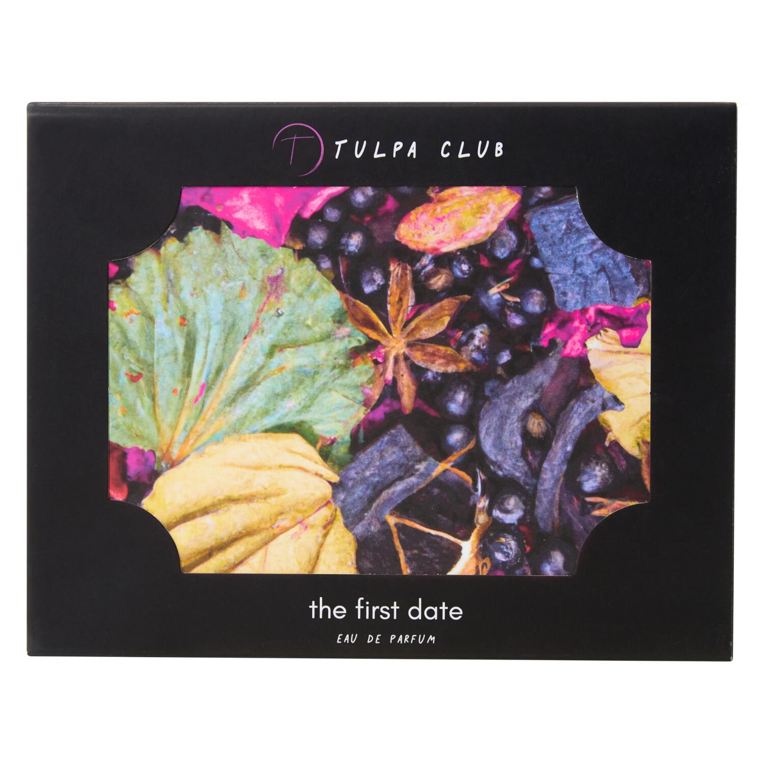 The First Date podle Tulpa Club je vůně pro ženy a muže. Toto je nová vůně. The First Date byl/a uveden/a v roce 2025. Vrchní tóny jsou Koření, Červené bobule a Citrusy; střední tóny jsouOkvětní lístky růží a Pudrové tóny ; základní tóny jsou Kůže a Dřevité tóny.