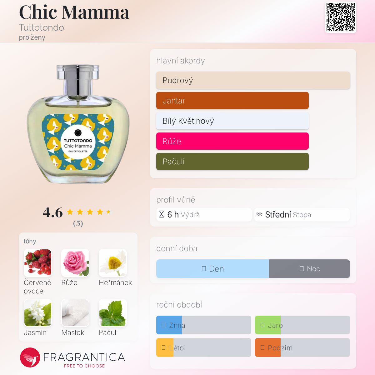 Chic Mamma podle Tuttotondo je Floral Woody Musk vůně pro ženy. Toto je nová vůně. Chic Mamma byl/a uveden/a v roce 2024. Vrchní tóny jsou Červené ovoce a Růže; střední tóny jsouHeřmánek, Jasmín, Růže a Mastek ; základní tóny jsou Pačuli, Veloutone, Jantar (ambra) a Pižmo.