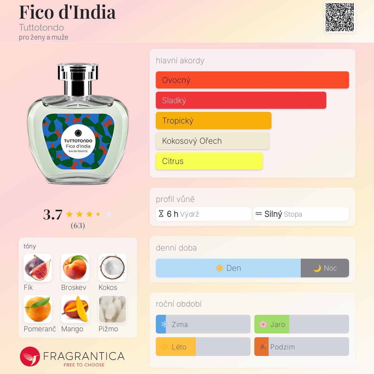 Fico d'India podle Tuttotondo je Floral Fruity vůně pro ženy a muže. Fico d'India byl/a uveden/a v roce 2016. Vrchní tóny jsou Fík a Pomeranč; střední tóny jsouBroskev, Mango a Brambořík ; základní tóny jsou Kokosový nektar a Pižmo.