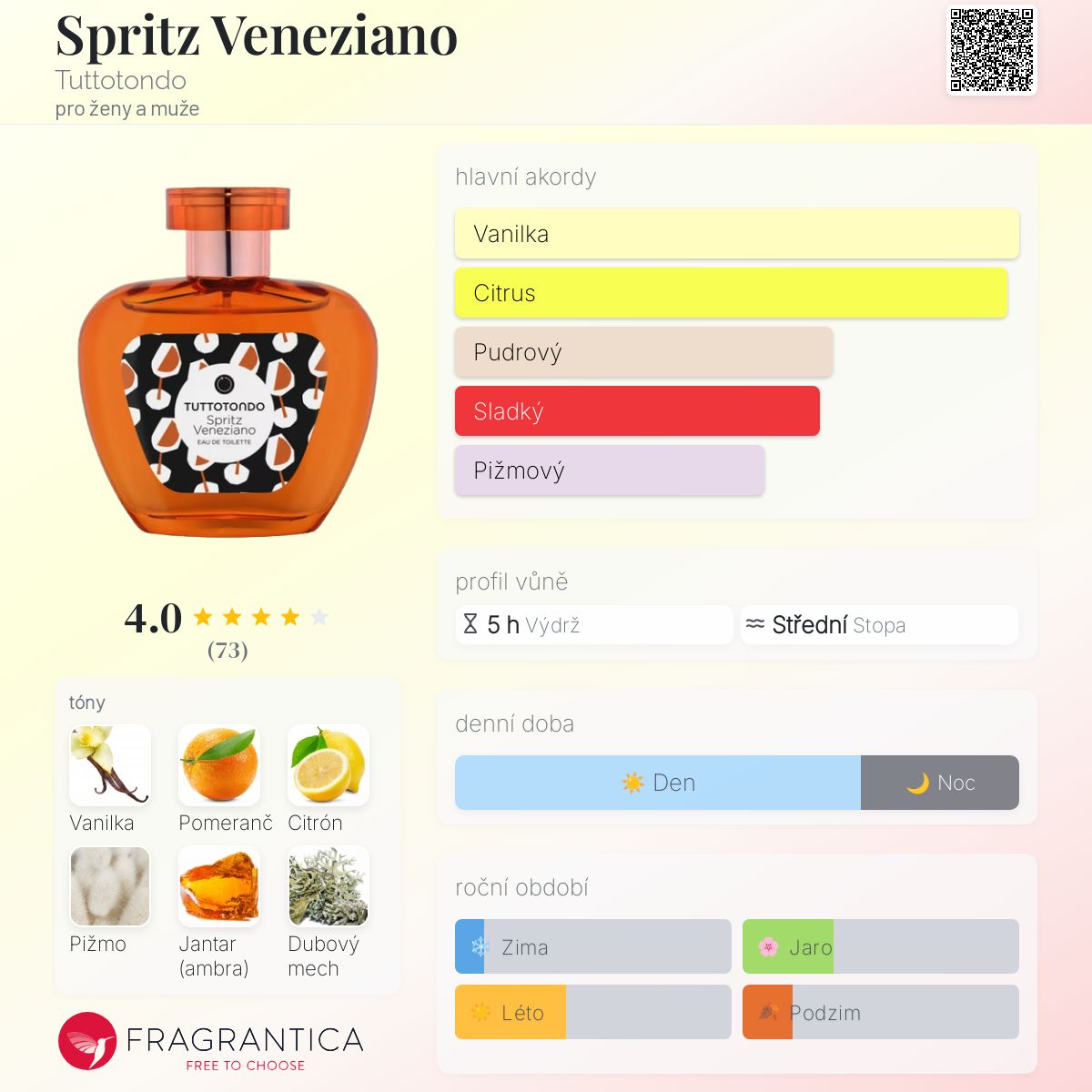 Spritz Veneziano podle Tuttotondo je Aromatic vůně pro ženy a muže. Spritz Veneziano byl/a uveden/a v roce 2020. Vrchní tóny jsou Citrón, Elemi a Šampaňské; střední tóny jsouPomeranč, Rozmarýn a Davana ; základní tóny jsou Vanilka, Pižmo, Jantar (ambra) a Mech.