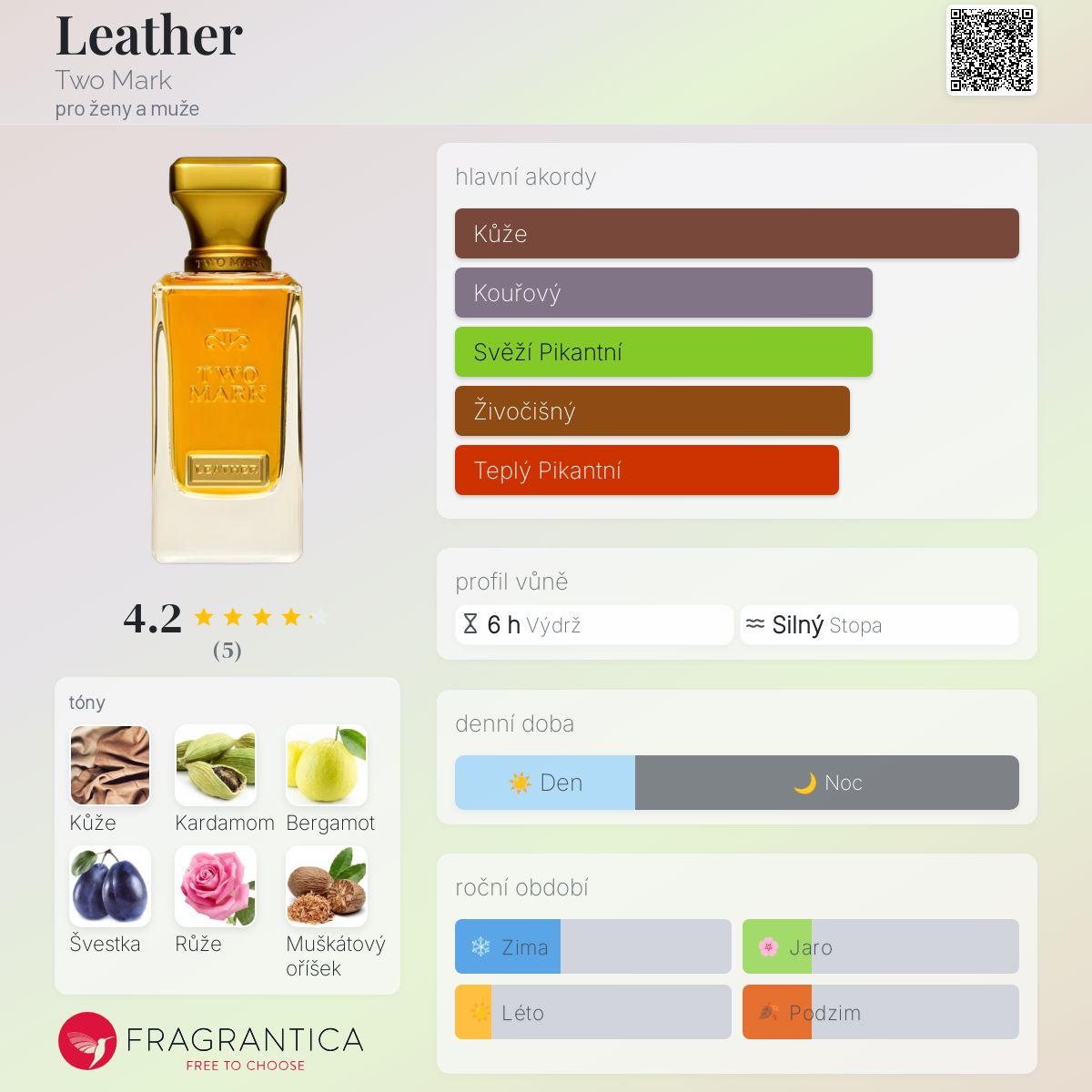 Leather podle Two Mark je Leather vůně pro ženy a muže. Leather byl/a uveden/a v roce 2021. Vrchní tóny jsou Kardamom, Bergamot a Švestka; střední tóny jsouBulharská růže, Muškátový oříšek a Fialka ; základní tóny jsou Kůže, Agarové dřevo (oud) a Kadidlo.