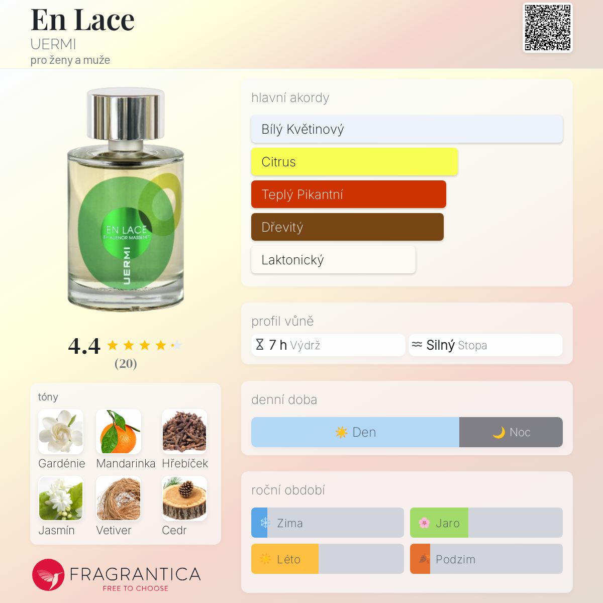 En Lace podle UERMI je Floral vůně pro ženy a muže. En Lace byl/a uveden/a v roce 2020. "Nosem" za touto vůní je Alienor Massenet. Vrchní tóny jsou Mandarinka a Hřebíček; střední tóny jsouGardénie, Jasmín a Karysa ; základní tóny jsou Vetiver a Cedr.
