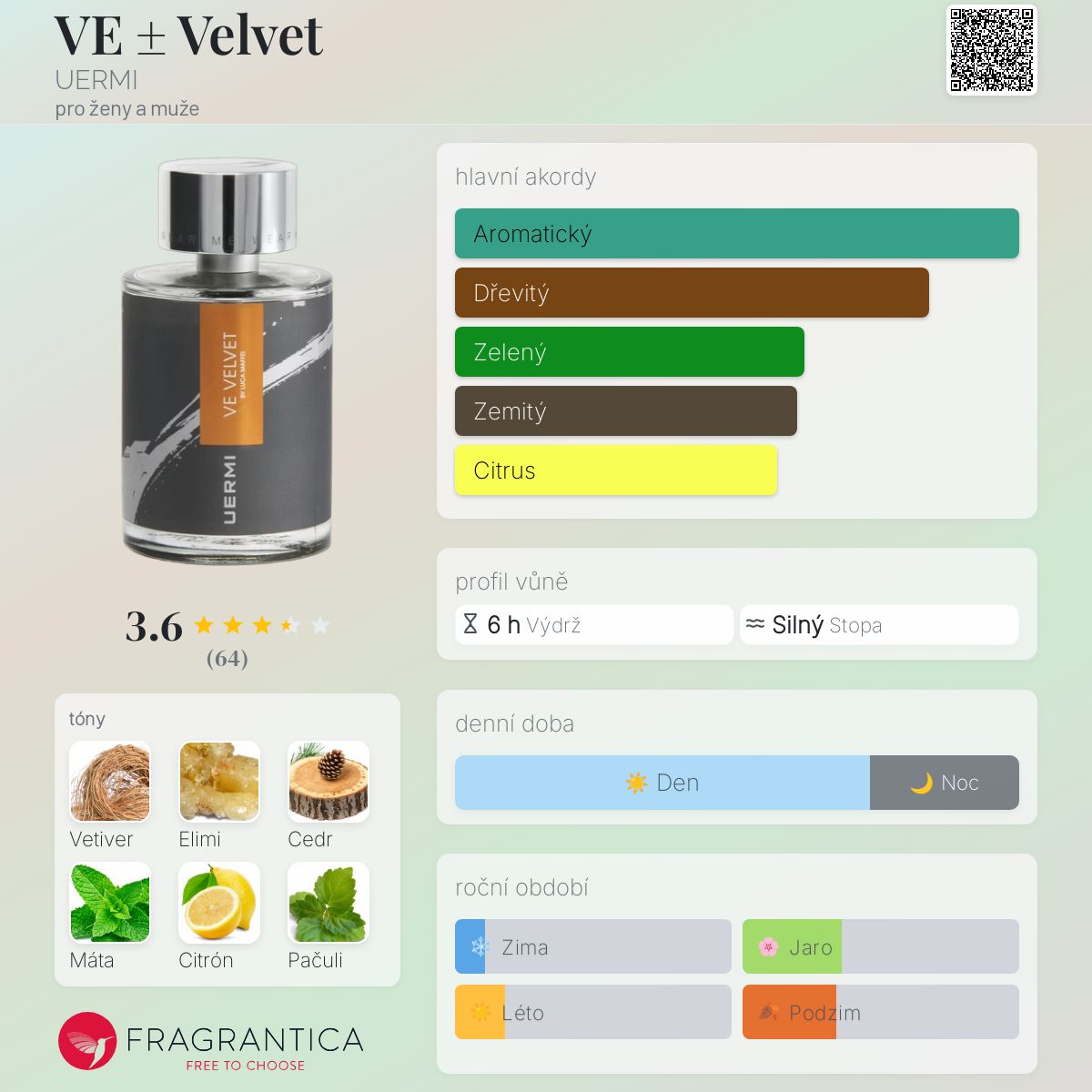 VE ± Velvet podle UERMI je Citrus Aromatic vůně pro ženy a muže. VE ± Velvet byl/a uveden/a v roce 2014. "Nosem" za touto vůní je Jean Jacques.