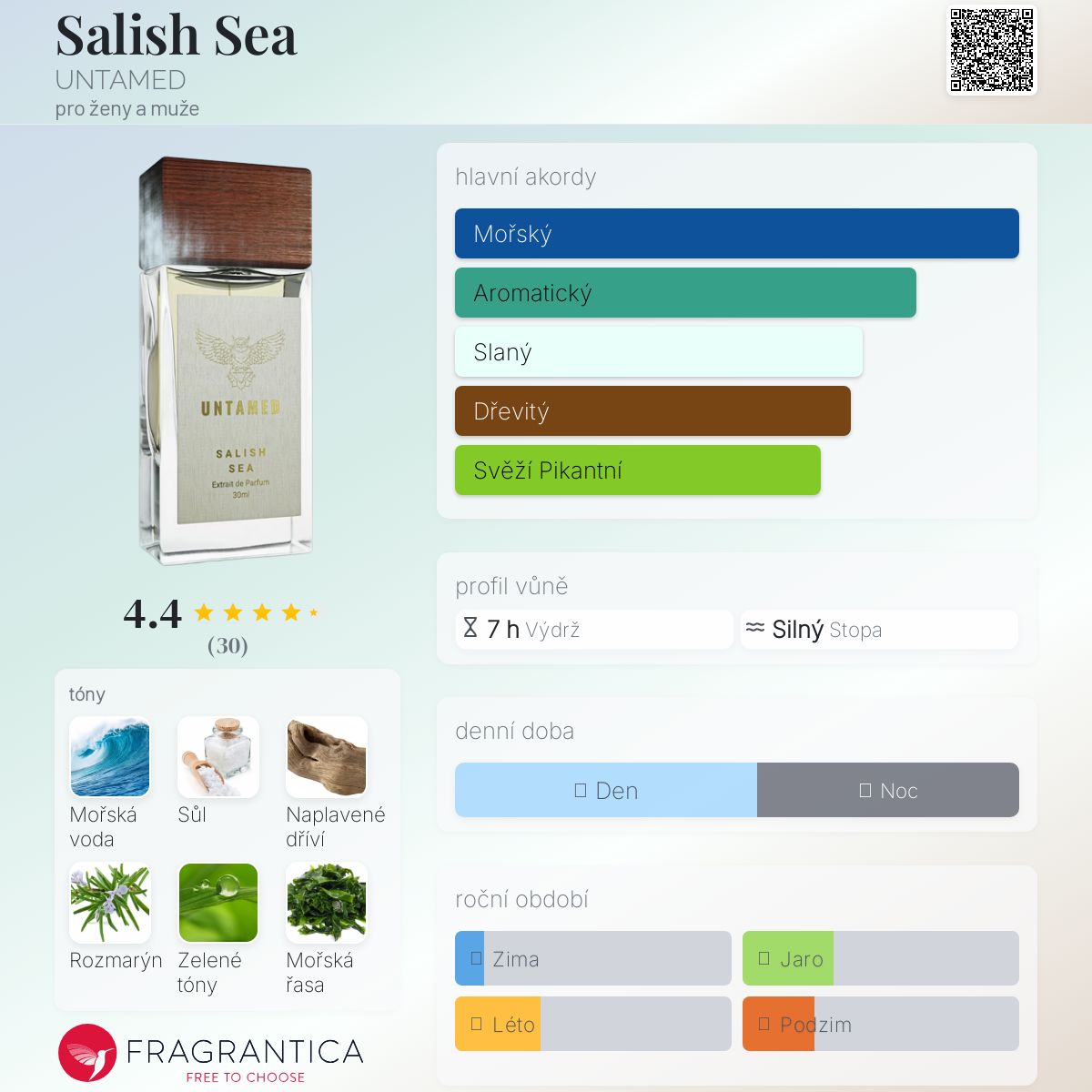 Salish Sea podle UNTAMED je Aromatic Aquatic vůně pro ženy a muže. Salish Sea byl/a uveden/a v roce 2022. "Nosem" za touto vůní je Sunyata Calogeros-Smith. Vrchní tóny jsou Mořská sůl, Rozmarýn, Bylinné tóny a Černý pepř; střední tóny jsouMořské tóny, Naplavené dříví, Mořská řasa, Zimolez a Konvalinka ; základní tóny jsou Kamýš (plážová tráva), Ambra, Dubový mech a Jedle.