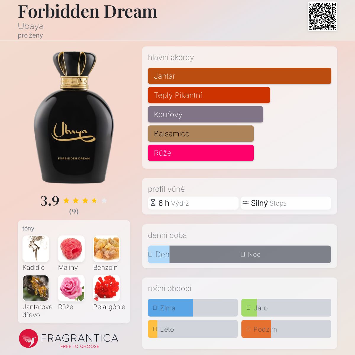 Forbidden Dream podle Ubaya je Orientální Woody vůně pro ženy. Forbidden Dream byl/a uveden/a v roce 2021. Vrchní tóny jsou Kadidlo a Maliny; střední tóny jsouBenzoin a Růže ; základní tóny jsou Jantarové dřevo a Pelargónie.