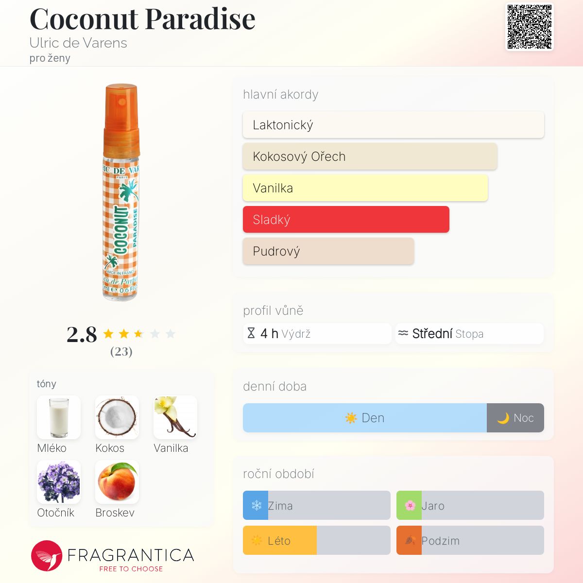 Coconut Paradise podle Ulric de Varens je Orientální Vanilla vůně pro ženy. Coconut Paradise byl/a uveden/a v roce 2013. Vrchní tóny jsou Kokosové mléko a Otočník; střední tóny jsouKokos a Vanilka ; základní tóny jsou Mléko a Broskev.