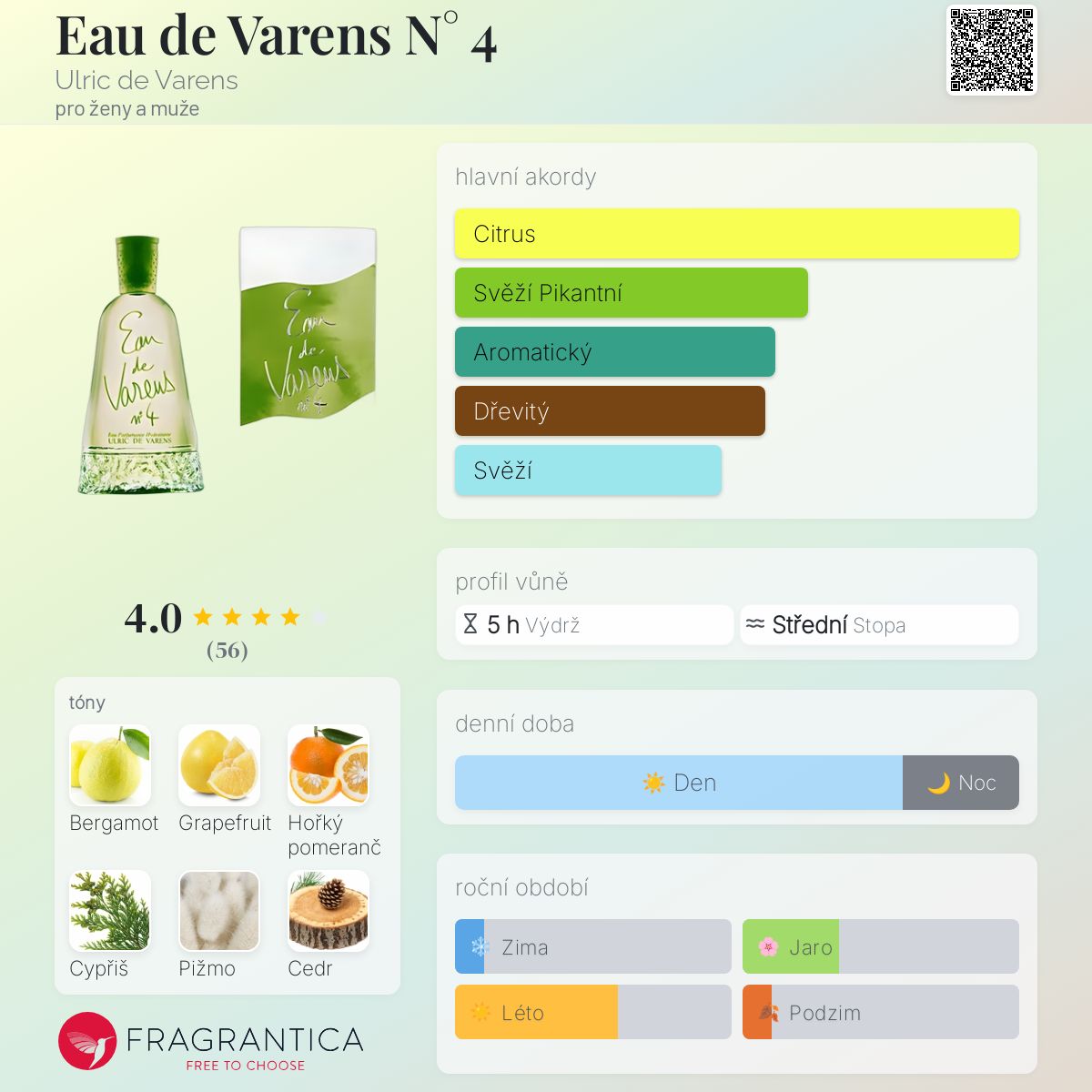 Eau de Varens N° 4 podle Ulric de Varens je Aromatic Green vůně pro ženy a muže. Vrchní tóny jsou Bergamot, Grapefruit a Hořký pomeranč; střední tóny jsouCypřiš, Konvalinka a Růže ; základní tóny jsou Pižmo, Cedr, Santalové dřevo a Jantar (ambra).