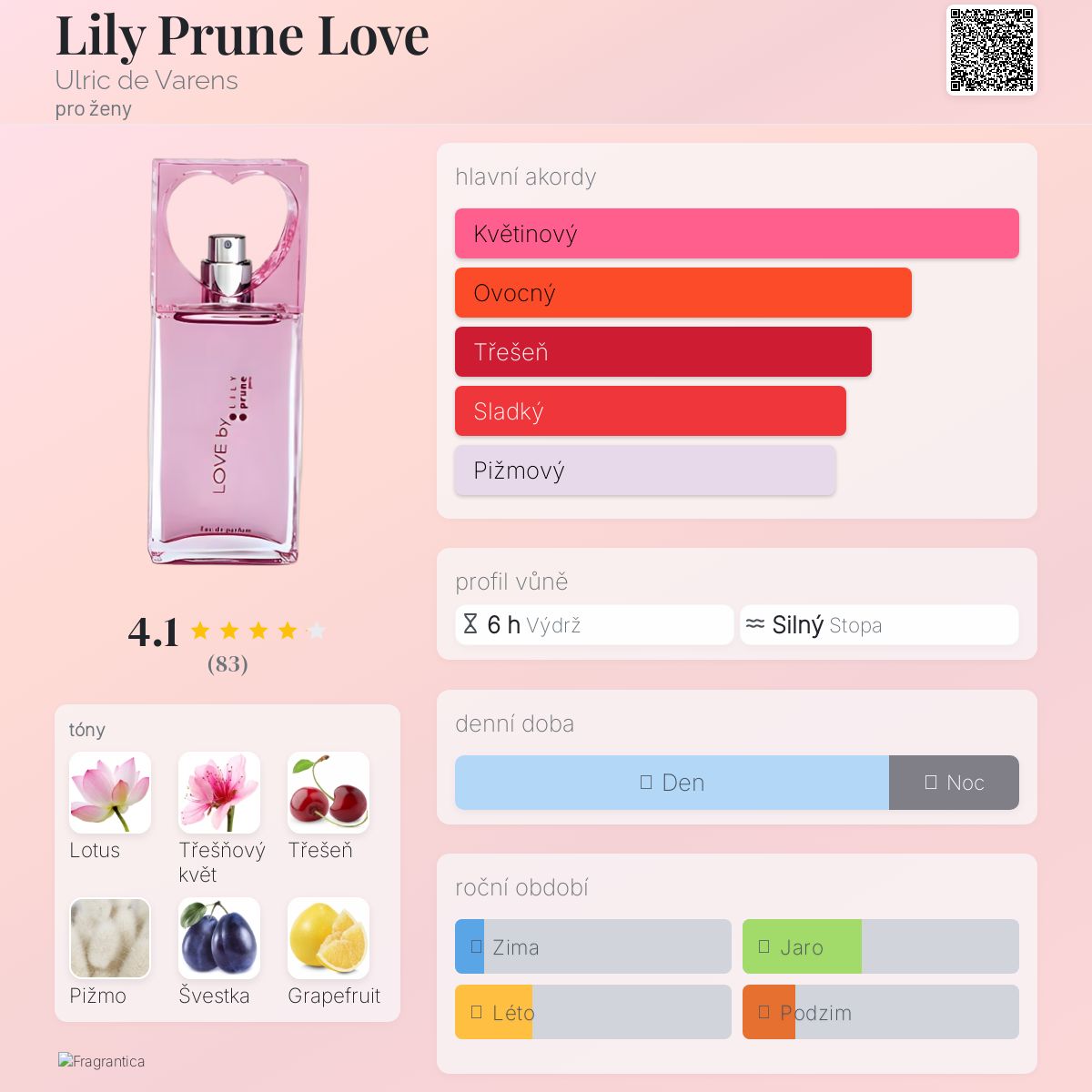 Lily Prune Love podle Ulric de Varens je Floral Fruity vůně pro ženy. Lily Prune Love byla spuštěna během 2000. Vrchní tóny jsou Třešeň, Švestka a Grapefruit; střední tóny jsouLotus a Třešňový květ ; základní tón je Pižmo.