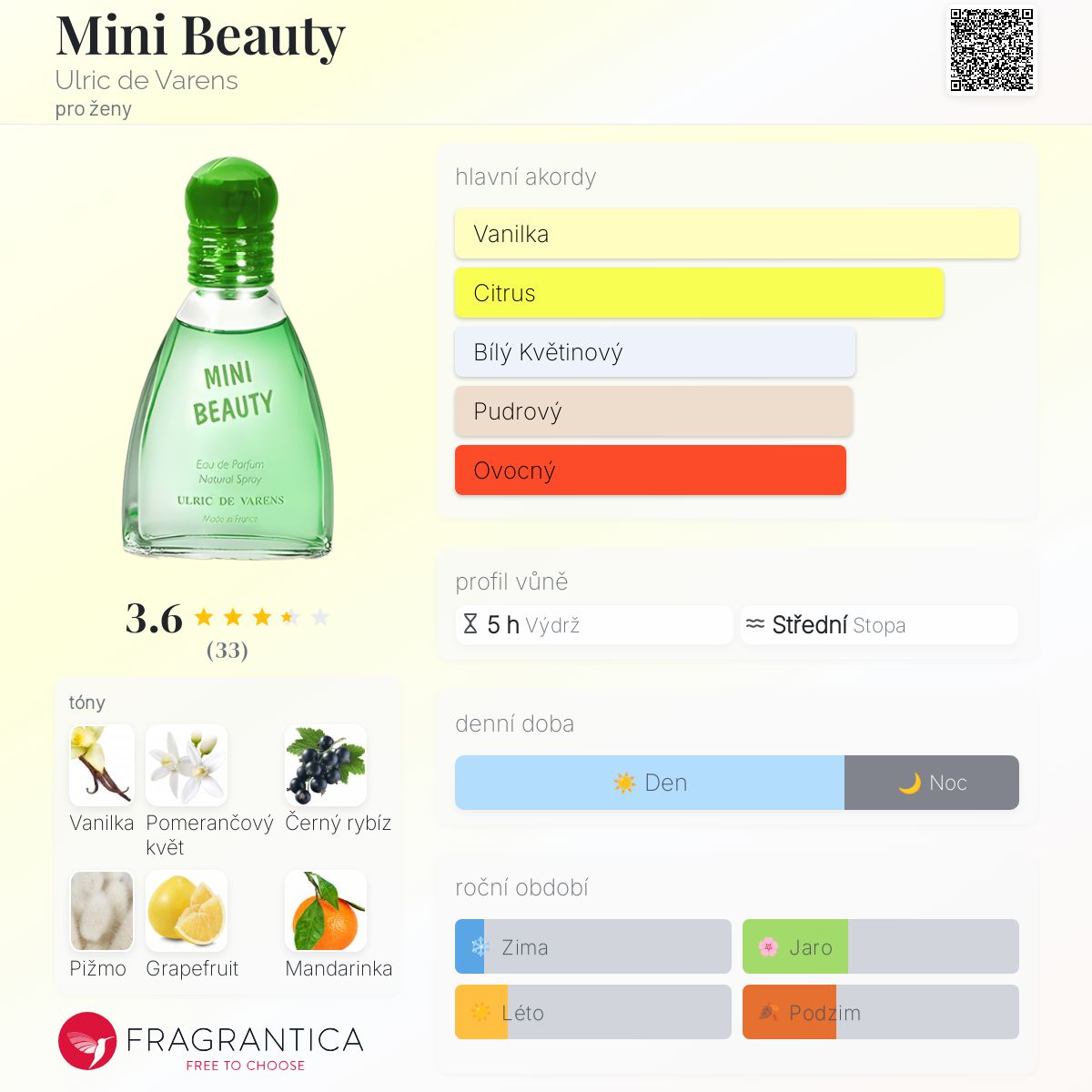 Mini Beauty podle Ulric de Varens je Floral Fruity vůně pro ženy. Mini Beauty byl/a uveden/a v roce 2015. Vrchní tóny jsou Černý rybíz, Grapefruit a Mandarinka; střední tón jePomerančový květ ; základní tóny jsou Bourbonská vanilka a Bílé pižmo.