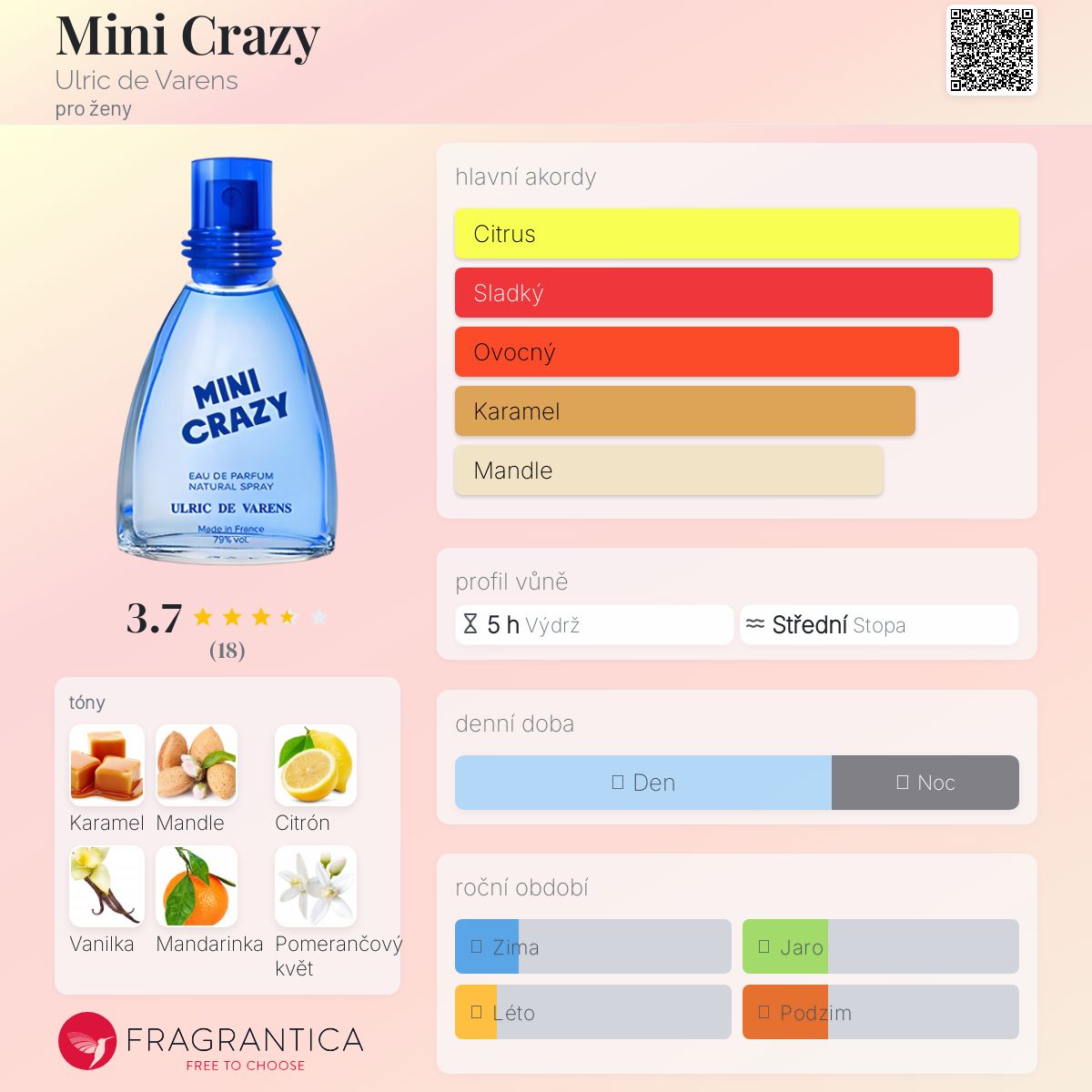 Mini Crazy podle Ulric de Varens je Floral Fruity Gourmand vůně pro ženy. Vrchní tóny jsou Mandle, Citrón, Mandarinka a Černý rybíz; střední tóny jsouPomerančový květ, Jasmín, Maliny a Růže ; základní tóny jsou Karamel, Vanilka a Fazole tonka.