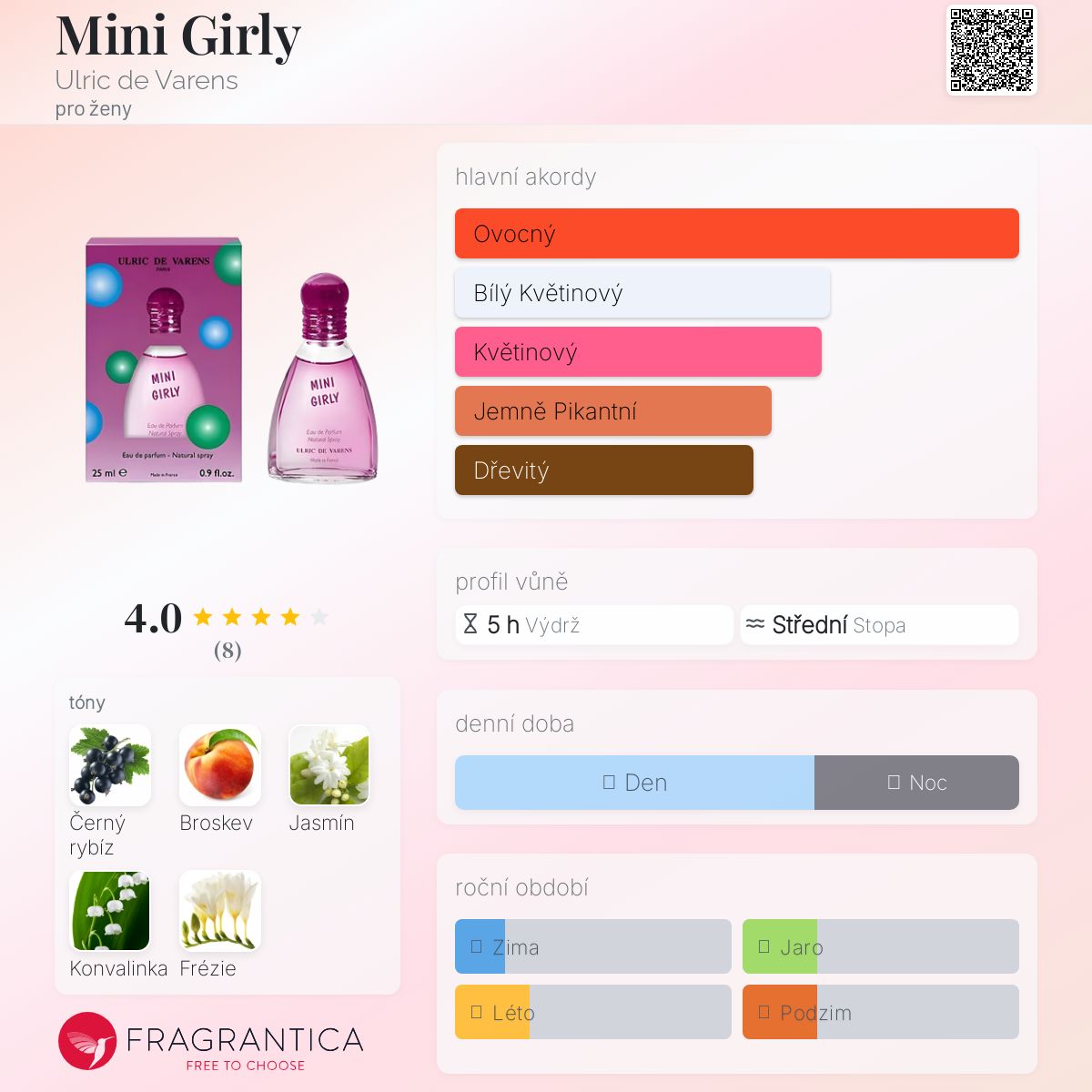 Mini Girly podle Ulric de Varens je Floral Fruity vůně pro ženy. Vrchní tóny jsou Černý rybíz a Broskev; střední tóny jsouJasmín, Konvalinka a Frézie ;