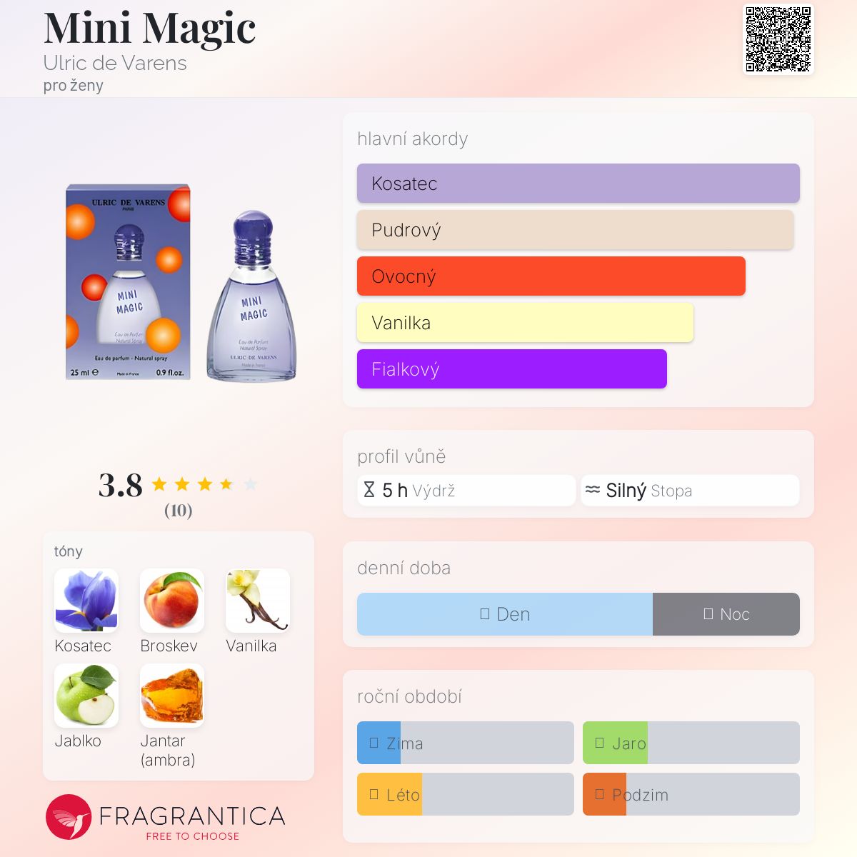Mini Magic podle Ulric de Varens je Floral Fruity vůně pro ženy. Vrchní tóny jsou Bílá broskev a Jablko; střední tón jeKosatec ; základní tóny jsou Vanilka a Jantar (ambra).