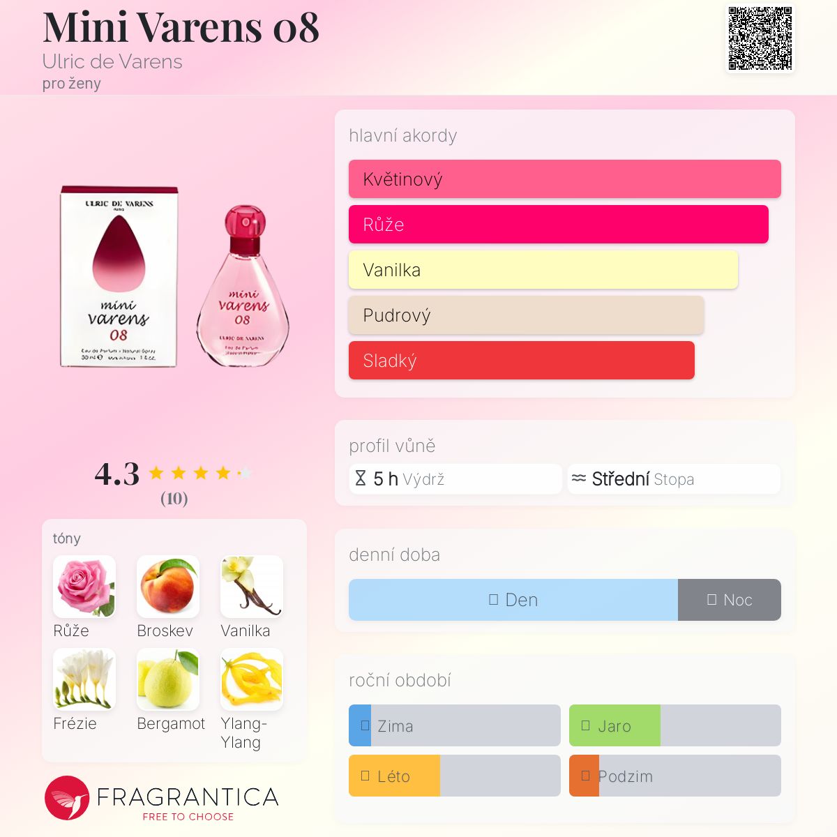 Mini Varens 08 podle Ulric de Varens je Orientální Floral vůně pro ženy. Mini Varens 08 byl/a uveden/a v roce 2010. Vrchní tóny jsou Růže, Bergamot a Ylang-Ylang; střední tóny jsouBroskev a Frézie ; základní tóny jsou Vanilka, Santalové dřevo a Pižmo.