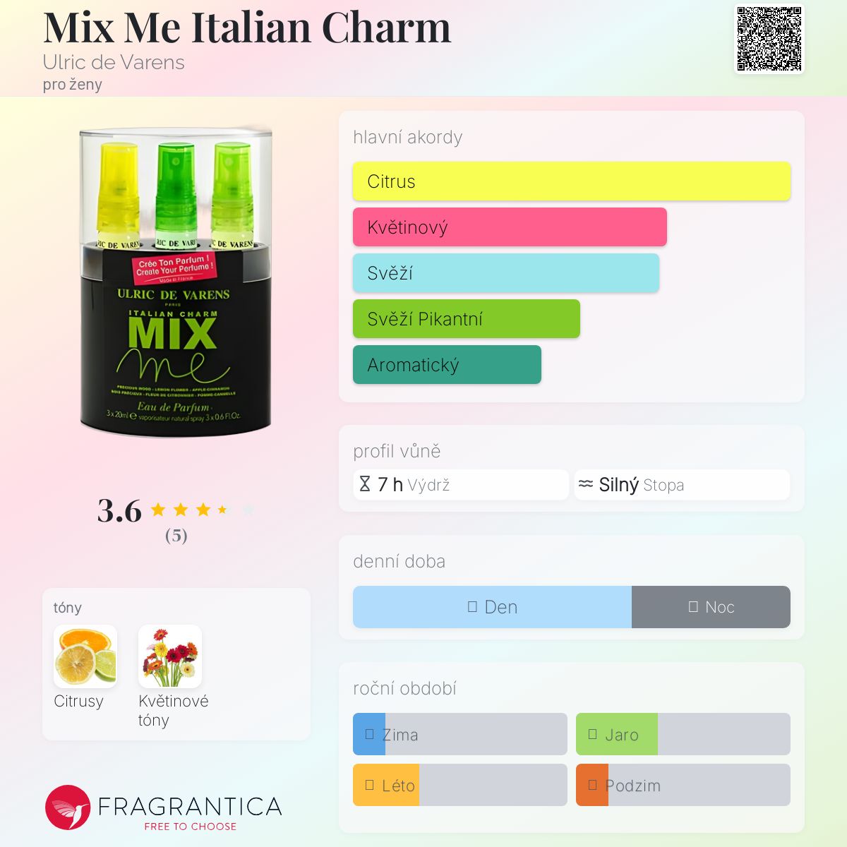 Mix Me Italian Charm podle Ulric de Varens je Citrus vůně pro ženy. Mix Me Italian Charm byl/a uveden/a v roce 2012.