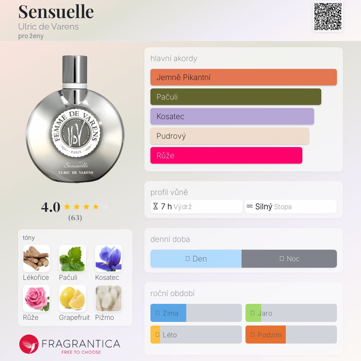 Sensuelle podle Ulric de Varens je Chypre Floral vůně pro ženy. Sensuelle byl/a uveden/a v roce 2014. Vrchní tóny jsou Lékořice a Grapefruit; střední tóny jsouKosatec a Růže ; základní tóny jsou Pačuli a Pižmo.