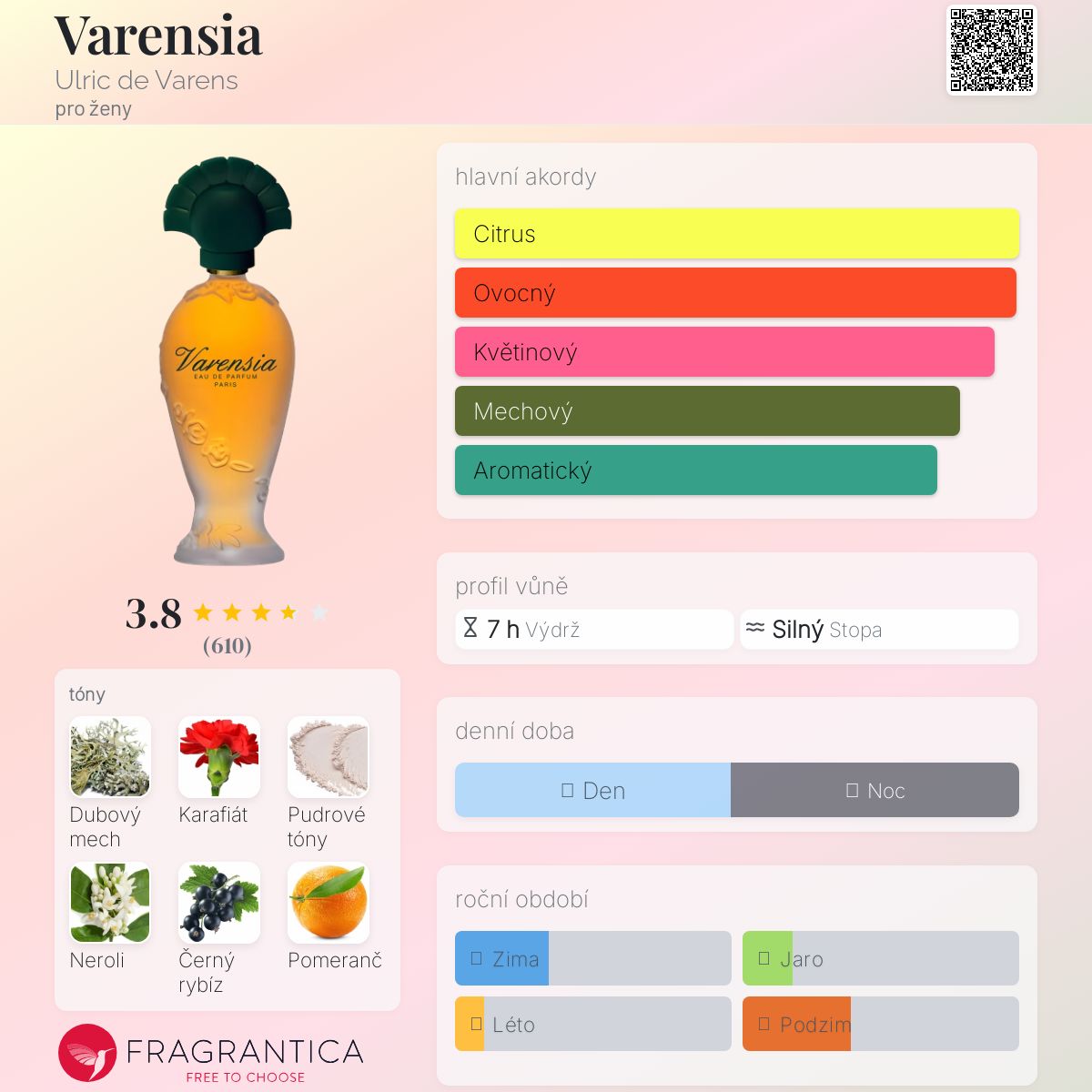 Varensia podle Ulric de Varens je Chypre Fruity vůně pro ženy. Varensia byl/a uveden/a v roce 1994. Vrchní tóny jsou Neroli, Pomeranč, Mandarinka, Maliny, Aldehydy, Hřebíček a Bergamot; střední tóny jsouČerný rybíz, Černý rybíz, Ylang-Ylang, Pelargónie, Růže, Jasmín a Lotus ; základní tóny jsou Dubový mech, Karafiát, Pudrové tóny, Vetiver, Santalové dřevo, Benzoin, Labdanum, Vanilka a Pačuli.