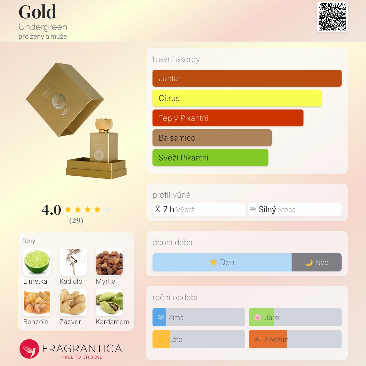 Gold podle Undergreen je Orientální vůně pro ženy a muže. Gold byl/a uveden/a v roce 2012. "Nosem" za touto vůní je Fabrice Olivieri. Vrchní tóny jsou Limetka, Citrón a Grapefruit; střední tóny jsouZázvor, Kardamom a Pomerančový květ ; základní tóny jsou Kadidlo, Myrha a Benzoin.