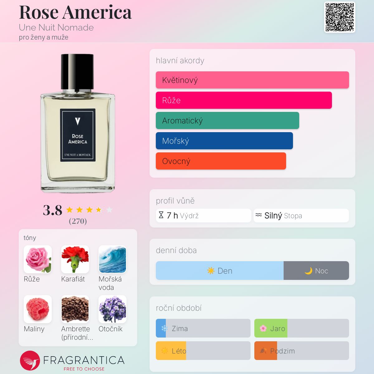 Rose America podle Une Nuit Nomade je Floral vůně pro ženy a muže. Rose America byl/a uveden/a v roce 2017. "Nosem" za touto vůní je Annick Menardo. Vrchní tóny jsou Mořské tóny a Maliny; střední tóny jsouBulharská růže a Karafiát ; základní tóny jsou Ambrette (přírodní pižmo) a Otočník.