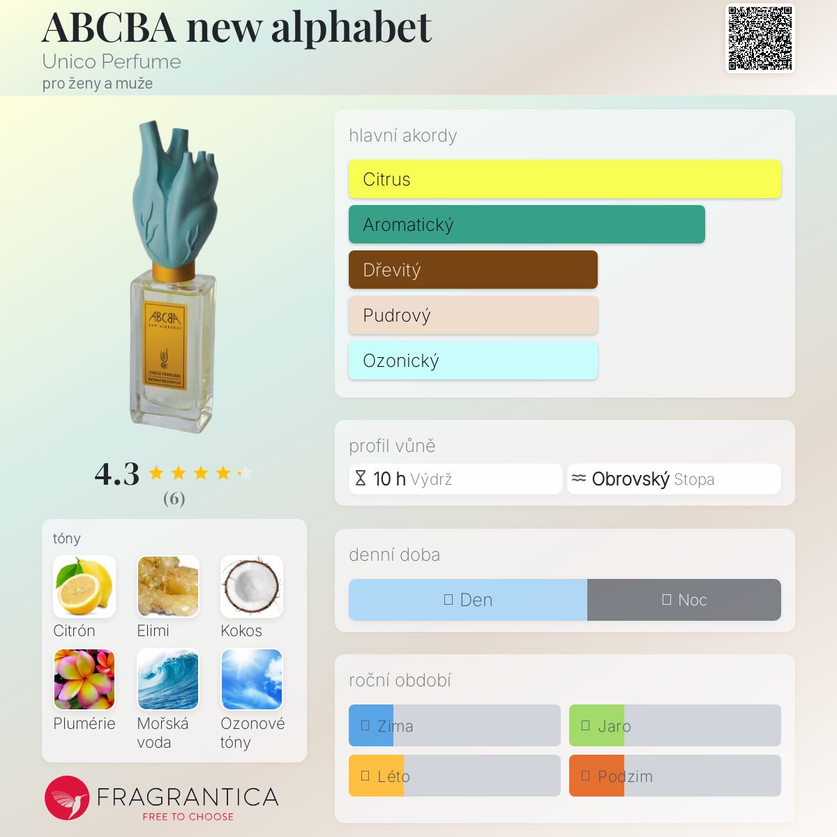 ABCBA new alphabet podle Unico Perfume je Aromatic Aquatic vůně pro ženy a muže. Toto je nová vůně. ABCBA new alphabet byl/a uveden/a v roce 2025. ABCBA new alphabet byl/a vytvořen/a Federica Russo a Giuseppe Amorese. Vrchní tóny jsou Citrón, Pryskyřice elimi a Kokos; střední tóny jsouPlumérie, Mořské tóny a Ozonové tóny ; základní tóny jsou Santalové dřevo a Bílé pižmo.
