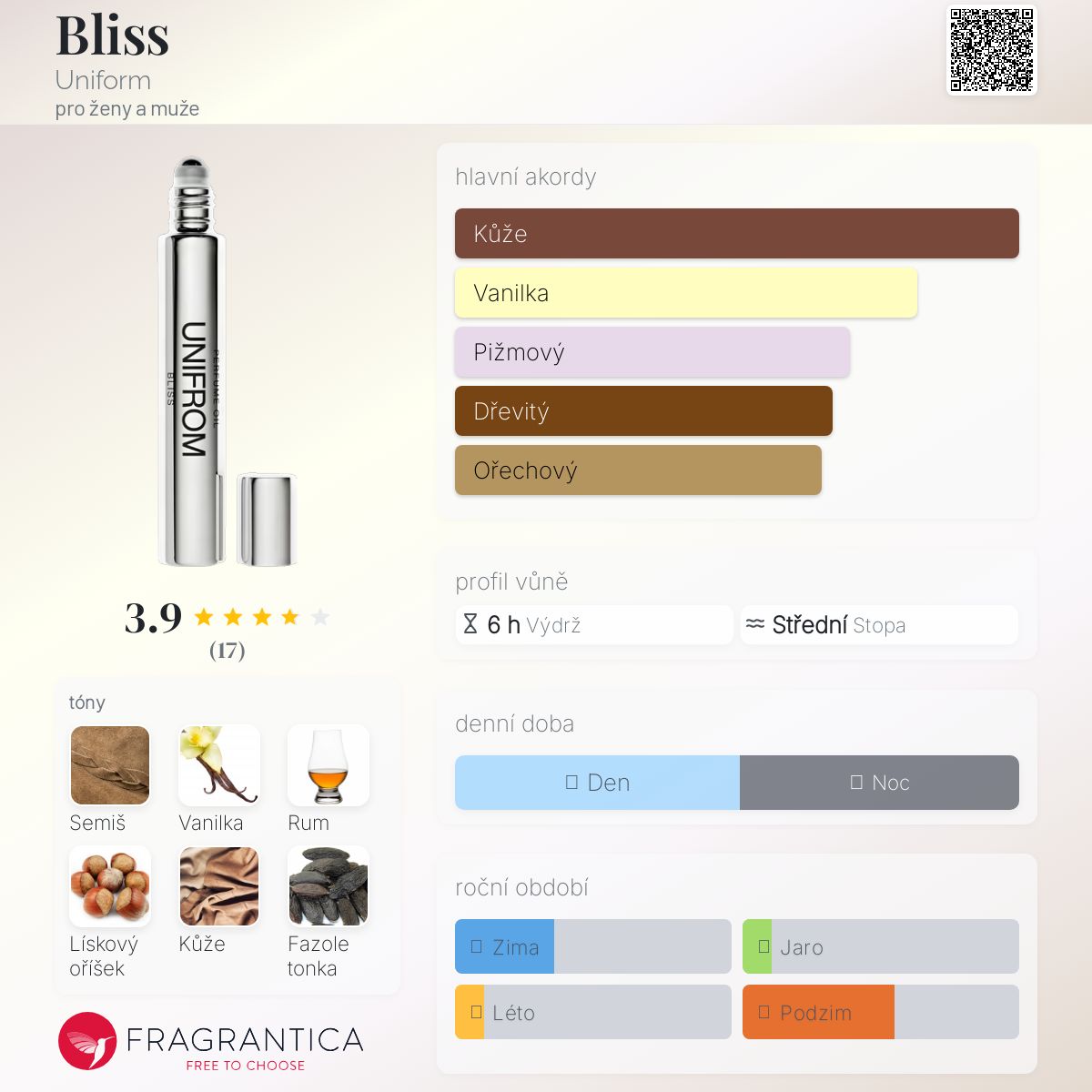 Bliss podle Unifrom je Leather vůně pro ženy a muže. Toto je nová vůně. Bliss byl/a uveden/a v roce 2023. "Nosem" za touto vůní je Patrice Revillard. Vrchní tóny jsou Rum, Lískový oříšek a Skořice; střední tóny jsouFazole tonka, Šafrán a Orris ; základní tóny jsou Semiš, Vanilka, Kůže a Santalové dřevo.