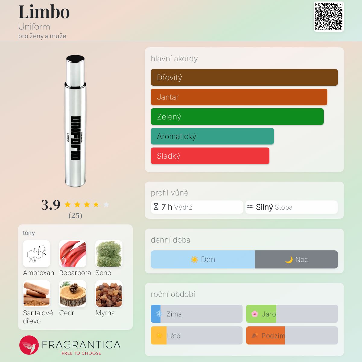 Limbo podle Unifrom je vůně pro ženy a muže. Limbo byl/a uveden/a v roce 2020. "Nosem" za touto vůní je Marie Schnirer. Vrchní tón je Rebarbora ; střední tóny jsouSeno a Ylang-Ylang ; základní tóny jsou Ambroxan, Santalové dřevo, Cedr a Myrha.